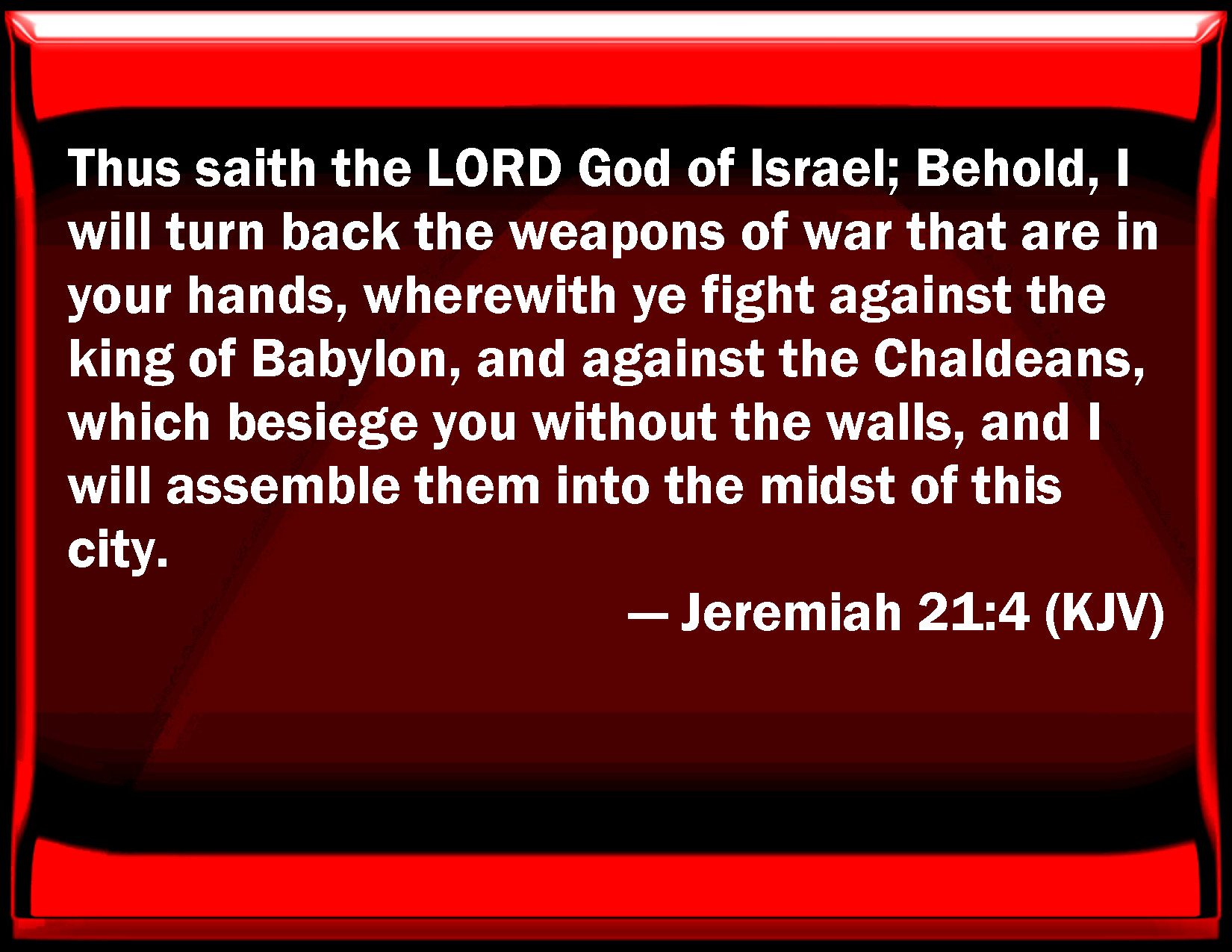 Bible Verse Slide Jeremiah 21:4 Thus said the LORD God of Israel; Behold, I will turn back the weapons of war that are in your hands, with which you fight against the king of Babylon, and against the Chaldeans, which besiege you without the walls, and I will assemble them into the middle of this city. KJV: Thus saith the LORD God of Israel; Behold, I will turn back the weapons of war that are in your hands, wherewith ye fight against the king of Babylon, and against the Chaldeans, which besiege you without the walls, and I will assemble them into the midst of this city. DRB: Thus saith the Lord, the God of Israel: Behold I will turn back the weapons of war that are in your hands, with which you fight against the king of Babylon, and the Chaldeans, that besiege you round about the walls: and I will gather them together in the midst of this city. DBT: Thus saith Jehovah the God of Israel: Behold, I will turn back the weapons of war that are in your hands, with which ye fight against the king of Babylon, and against the Chaldeans who besiege you, outside the walls, and I will assemble them into the midst of this city. ERV: Thus saith the LORD, the God of Israel, Behold, I will turn back the weapons of war that are in your hands; wherewith ye fight against the king of Babylon, and against the Chaldeans which besiege you, without the walls, and I will gather them into the midst of this city. WBT: Thus saith the LORD God of Israel; Behold, I will turn back the weapons of war that are in your hands, with which ye fight against the king of Babylon, and against the Chaldeans, who besiege you without the walls, and I will assemble them into the midst of this city. WEB: Thus says Yahweh, the God of Israel, Behold, I will turn back the weapons of war that are in your hands, with which you fight against the king of Babylon, and against the Chaldeans who besiege you, without the walls; and I will gather them into the midst of this city. YLT: Thus said Jehovah, God of Israel: Lo, I am turning round the weapons of battle That are in your hand, With which ye do fight the king of Babylon, And the Chaldeans, who are laying siege against you, At the outside of the wall, And I have gathered them into the midst of this city,Links Jeremiah 21:4 NIV • Jeremiah 21:4 NLT • Jeremiah 21:4 ESV • Jeremiah 21:4 NASB • Jeremiah 21:4 KJV • Jeremiah 21:4 Interlinear • Jeremiah 21:4 Commentaries • Jeremiah 21:4 Parallel Texts • Jeremiah 21:4 Bible Apps • Jeremiah 21:4 Parallel • Bible Hub |