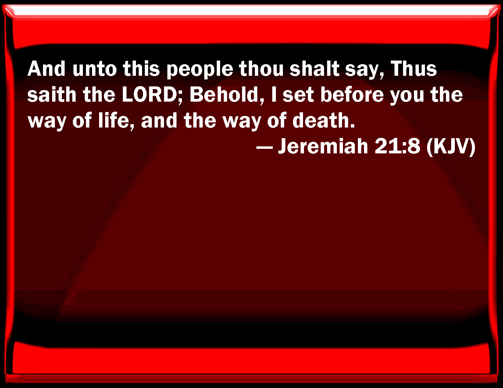 Bible Verse Slide Jeremiah 21:8 And to this people you shall say, Thus said the LORD; Behold, I set before you the way of life, and the way of death. KJV: And unto this people thou shalt say, Thus saith the LORD; Behold, I set before you the way of life, and the way of death. DRB: And to this people thou shalt say: Thus saith the Lord: Behold I set before you the way of life, and the way of death. DBT: And unto this people thou shalt say, Thus saith Jehovah: Behold, I set before you the way of life, and the way of death. ERV: And unto this people thou shalt say, Thus saith the LORD: Behold, I set before you the way of life and the way of death. WBT: And to this people thou shalt say, Thus saith the LORD; Behold, I set before you the way of life, and the way of death. WEB: To this people you shall say, Thus says Yahweh: Behold, I set before you the way of life and the way of death. YLT: And unto this people thou dost say, Thus said Jehovah: Lo, I am setting before you the way of life, And the way of death!Links Jeremiah 21:8 NIV • Jeremiah 21:8 NLT • Jeremiah 21:8 ESV • Jeremiah 21:8 NASB • Jeremiah 21:8 KJV • Jeremiah 21:8 Interlinear • Jeremiah 21:8 Commentaries • Jeremiah 21:8 Parallel Texts • Jeremiah 21:8 Bible Apps • Jeremiah 21:8 Parallel • Bible Hub |
