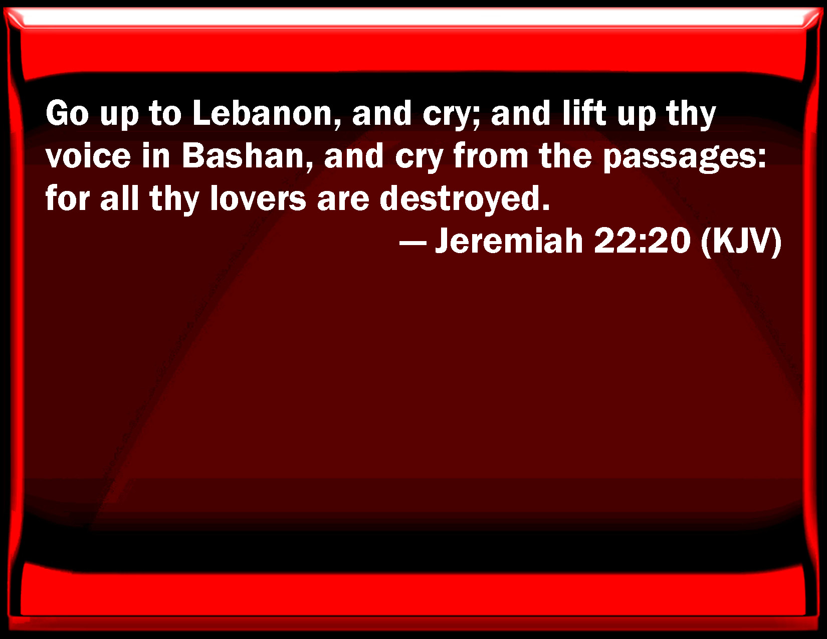Bible Verse Slide Jeremiah 22:20 Go up to Lebanon, and cry; and lift up your voice in Bashan, and cry from the passages: for all your lovers are destroyed. KJV: Go up to Lebanon, and cry; and lift up thy voice in Bashan, and cry from the passages: for all thy lovers are destroyed. DRB: Go up to Libanus, and cry: and lift up thy voice in Basan, and cry to them that pass by, for all thy lovers are destroyed. DBT: Go up to Lebanon, and cry; and give forth thy voice in Bashan, and cry from the heights of Abarim: for all thy lovers are destroyed. ERV: Go up to Lebanon, and cry; and lift up thy voice in Bashan: and cry from Abarim; for all thy lovers are destroyed. WBT: Go up to Lebanon, and cry; and lift up thy voice in Bashan, and cry from the passages: for all thy lovers are destroyed. WEB: Go up to Lebanon, and cry; and lift up your voice in Bashan, and cry from Abarim; for all your lovers are destroyed. YLT: Go up to Lebanon, and cry, And in Bashan give forth thy voice, And cry from Abarim, For destroyed have been all loving thee.Links Jeremiah 22:20 NIV • Jeremiah 22:20 NLT • Jeremiah 22:20 ESV • Jeremiah 22:20 NASB • Jeremiah 22:20 KJV • Jeremiah 22:20 Interlinear • Jeremiah 22:20 Commentaries • Jeremiah 22:20 Parallel Texts • Jeremiah 22:20 Bible Apps • Jeremiah 22:20 Parallel • Bible Hub |