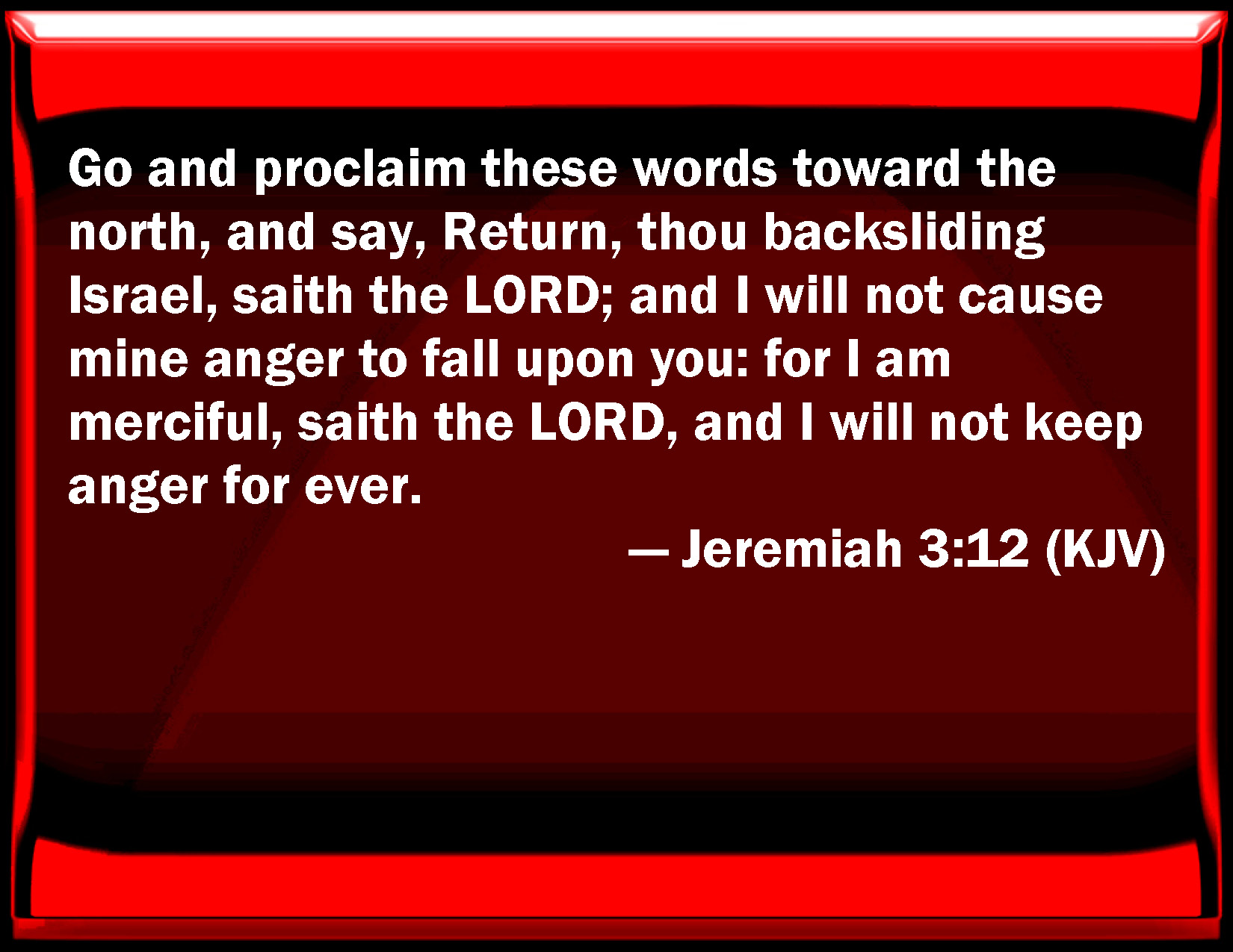 Bible Verse Slide Jeremiah 3:12 Go and proclaim these words toward the north, and say, Return, you backsliding Israel, said the LORD; and I will not cause my anger to fall on you: for I am merciful, said the LORD, and I will not keep anger for ever. KJV: Go and proclaim these words toward the north, and say, Return, thou backsliding Israel, saith the LORD; and I will not cause mine anger to fall upon you: for I am merciful, saith the LORD, and I will not keep anger for ever. DRB: Go, and proclaim these words toward the north, and thou shalt say: Return, O rebellious Israel, saith the Lord, and I will not turn away my face from you: for I am holy, saith the Lord, and I will not be angry for ever. DBT: Go and proclaim these words toward the north, and say, Return, thou backsliding Israel, saith Jehovah: I will not make my face dark upon you; for I am merciful, saith Jehovah; I will not keep anger for ever. ERV: Go, and proclaim these words toward the north, and say, Return, thou backsliding Israel, saith the LORD; I will not look in anger upon you: for I am merciful, saith the LORD, I will not keep anger for ever. WBT: Go and proclaim these words towards the north, and say, Return, thou backsliding Israel, saith the LORD; and I will not cause my anger to fall upon you: for I am merciful, saith the LORD, and I will not keep anger for ever. WEB: Go, and proclaim these words toward the north, and say, 'Return, you backsliding Israel,' says Yahweh; 'I will not look in anger on you; for I am merciful,' says Yahweh. 'I will not keep [anger] forever. YLT: Go, and thou hast proclaimed these words toward the north, and hast said, Turn back, O backsliding Israel, An affirmation of Jehovah! I cause not Mine anger to fall upon you, For I am kind, an affirmation of Jehovah, I watch not to the age.Links Jeremiah 3:12 NIV • Jeremiah 3:12 NLT • Jeremiah 3:12 ESV • Jeremiah 3:12 NASB • Jeremiah 3:12 KJV • Jeremiah 3:12 Interlinear • Jeremiah 3:12 Commentaries • Jeremiah 3:12 Parallel Texts • Jeremiah 3:12 Bible Apps • Jeremiah 3:12 Parallel • Bible Hub |