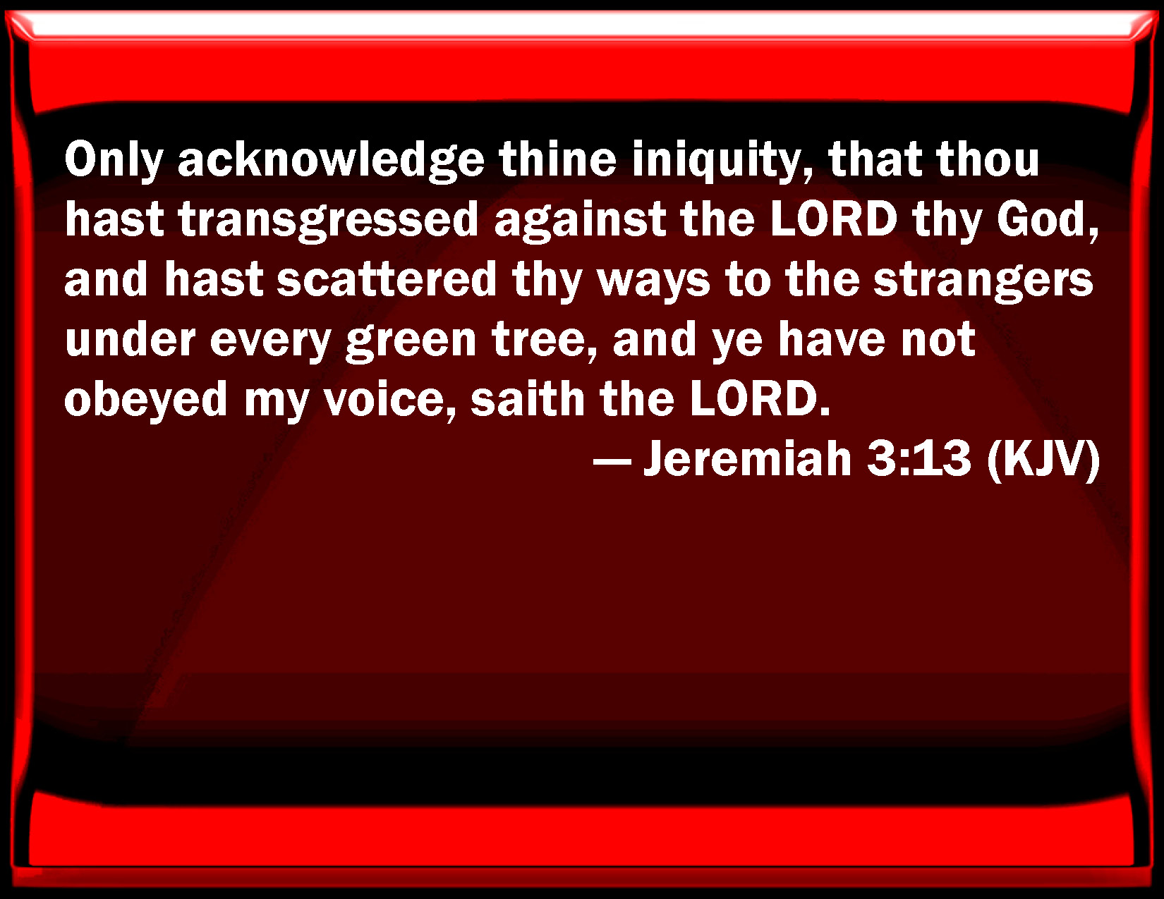 Bible Verse Slide Jeremiah 3:13 Only acknowledge your iniquity, that you have transgressed against the LORD your God, and have scattered your ways to the strangers under every green tree, and you have not obeyed my voice, said the LORD. KJV: Only acknowledge thine iniquity, that thou hast transgressed against the LORD thy God, and hast scattered thy ways to the strangers under every green tree, and ye have not obeyed my voice, saith the LORD. DRB: But yet acknowledge thy iniquity, that thou hast transgressed against the Lord thy God: and thou hast scattered thy ways to strangers under every green tree, and hast not heard my voice, saith the Lord. DBT: Only acknowledge thine iniquity, that thou hast transgressed against Jehovah thy God, and hast turned thy ways hither and thither to the strangers under every green tree; and ye have not hearkened to my voice, saith Jehovah. ERV: Only acknowledge thine iniquity, that thou hast transgressed against the LORD thy God, and hast scattered thy ways to the strangers under every green tree, and ye have not obeyed my voice, saith the LORD. WBT: Only acknowledge thy iniquity, that thou hast transgressed against the LORD thy God, and hast scattered thy ways to the strangers under every green tree, and ye have not obeyed my voice, saith the LORD. WEB: Only acknowledge your iniquity, that you have transgressed against Yahweh your God, and have scattered your ways to the strangers under every green tree, and you have not obeyed my voice,' says Yahweh." YLT: Only, know thine iniquity, For against Jehovah thy God thou hast transgressed, And thou dost scatter thy ways to strangers, Under every green tree, And to My voice thou hast not hearkened, An affirmation of Jehovah.Links Jeremiah 3:13 NIV • Jeremiah 3:13 NLT • Jeremiah 3:13 ESV • Jeremiah 3:13 NASB • Jeremiah 3:13 KJV • Jeremiah 3:13 Interlinear • Jeremiah 3:13 Commentaries • Jeremiah 3:13 Parallel Texts • Jeremiah 3:13 Bible Apps • Jeremiah 3:13 Parallel • Bible Hub |