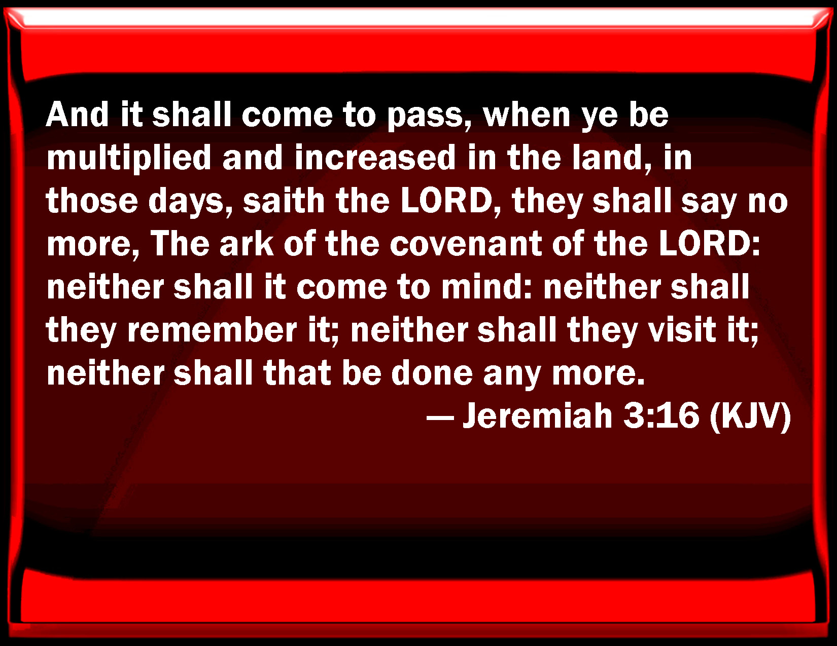 Bible Verse Slide Jeremiah 3:16 And it shall come to pass, when you be multiplied and increased in the land, in those days, said the LORD, they shall say no more, The ark of the covenant of the LORD: neither shall it come to mind: neither shall they remember it; neither shall they visit it; neither shall that be done any more. KJV: And it shall come to pass, when ye be multiplied and increased in the land, in those days, saith the LORD, they shall say no more, The ark of the covenant of the LORD: neither shall it come to mind: neither shall they remember it; neither shall they visit it; neither shall that be done any more. DRB: And when you shall be multiplied, and increase in the land in those days, saith the Lord, they shall say no more: The ark of the covenant of the Lord: neither shall it come upon the heart, neither shall they remember it, neither shall it be visited, neither shall that be done any more. DBT: And it shall come to pass, when ye are multiplied in the land and become fruitful, in those days, saith Jehovah, they shall say no more, Ark of the covenant of Jehovah! neither shall it come to mind, nor shall they remember it, nor shall they visit it; neither shall it be done any more. ERV: And it shall come to pass, when ye be multiplied and increased in the land, in those days, saith the LORD, they shall say no more, The ark of the covenant of the LORD; neither shall it come to mind: neither shall they remember it; neither shall they visit it; neither shall that be done any more. WBT: And it shall come to pass, when ye shall be multiplied and increased in the land, in those days, saith the LORD, they shall say no more, The ark of the covenant of the LORD: neither shall it come to mind: neither shall they remember it; neither shall they visit it; neither shall that be done any more. WEB: It shall come to pass, when you are multiplied and increased in the land, in those days," says Yahweh, "they shall say no more, 'The ark of the covenant of Yahweh!' neither shall it come to mind; neither shall they remember it; neither shall they miss it; neither shall it be made any more. YLT: And it hath come to pass, when ye are multiplied, And have been fruitful in the land, In those days — an affirmation of Jehovah, They say not any more, 'The ark of the covenant of Jehovah,' Nor doth it go up on the heart, Nor do they remember concerning it, Nor do they inspect, nor is it made again.Links Jeremiah 3:16 NIV • Jeremiah 3:16 NLT • Jeremiah 3:16 ESV • Jeremiah 3:16 NASB • Jeremiah 3:16 KJV • Jeremiah 3:16 Interlinear • Jeremiah 3:16 Commentaries • Jeremiah 3:16 Parallel Texts • Jeremiah 3:16 Bible Apps • Jeremiah 3:16 Parallel • Bible Hub |