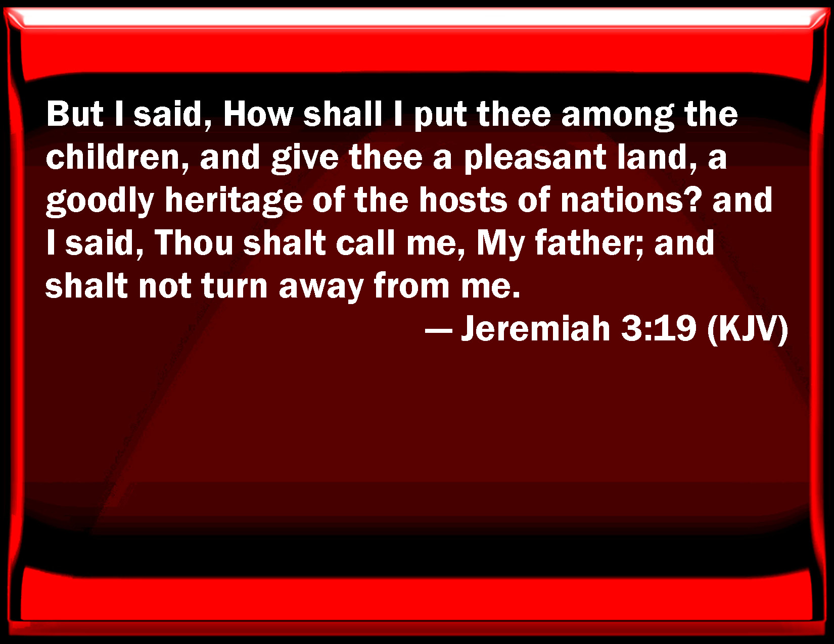 Bible Verse Slide Jeremiah 3:19 But I said, How shall I put you among the children, and give you a pleasant land, a goodly heritage of the hosts of nations? and I said, You shall call me, My father; and shall not turn away from me. KJV: But I said, How shall I put thee among the children, and give thee a pleasant land, a goodly heritage of the hosts of nations? and I said, Thou shalt call me, My father; and shalt not turn away from me. DRB: But I said: How shall I put thee among the children, and give thee a lovely land, the goodly inheritance of the armies of the Gentiles? And I said: Thou shalt call me father and shalt cease to walk after me. DBT: And as for me, I said, How shall I put thee among the children, and give thee the pleasant land, the goodly inheritance of the hosts of the nations? And I said, Thou shalt call me, My father; and shalt not turn away from following me. ERV: But I said, How shall I put thee among the children, and give thee a pleasant land, a goodly heritage of the hosts of the nations? and I said, Ye shall call me My father; and shall not turn away from following me. WBT: But I said, How shall I put thee among the children, and give thee a pleasant land, a goodly heritage of the hosts of nations? and I said, Thou shalt call me, My father; and shalt not turn away from me. WEB: "But I said, 'How I would put you among the children, and give you a pleasant land, a goodly heritage of the armies of the nations!' and I said, 'You shall call me "My Father," and shall not turn away from following me.' YLT: And I have said, How do I put thee among the sons, And give to thee a desirable land, A beauteous inheritance of the hosts of nations, And I say, My father — ye do call to Me, And from after Me ye do not turn back.Links Jeremiah 3:19 NIV • Jeremiah 3:19 NLT • Jeremiah 3:19 ESV • Jeremiah 3:19 NASB • Jeremiah 3:19 KJV • Jeremiah 3:19 Interlinear • Jeremiah 3:19 Commentaries • Jeremiah 3:19 Parallel Texts • Jeremiah 3:19 Bible Apps • Jeremiah 3:19 Parallel • Bible Hub |