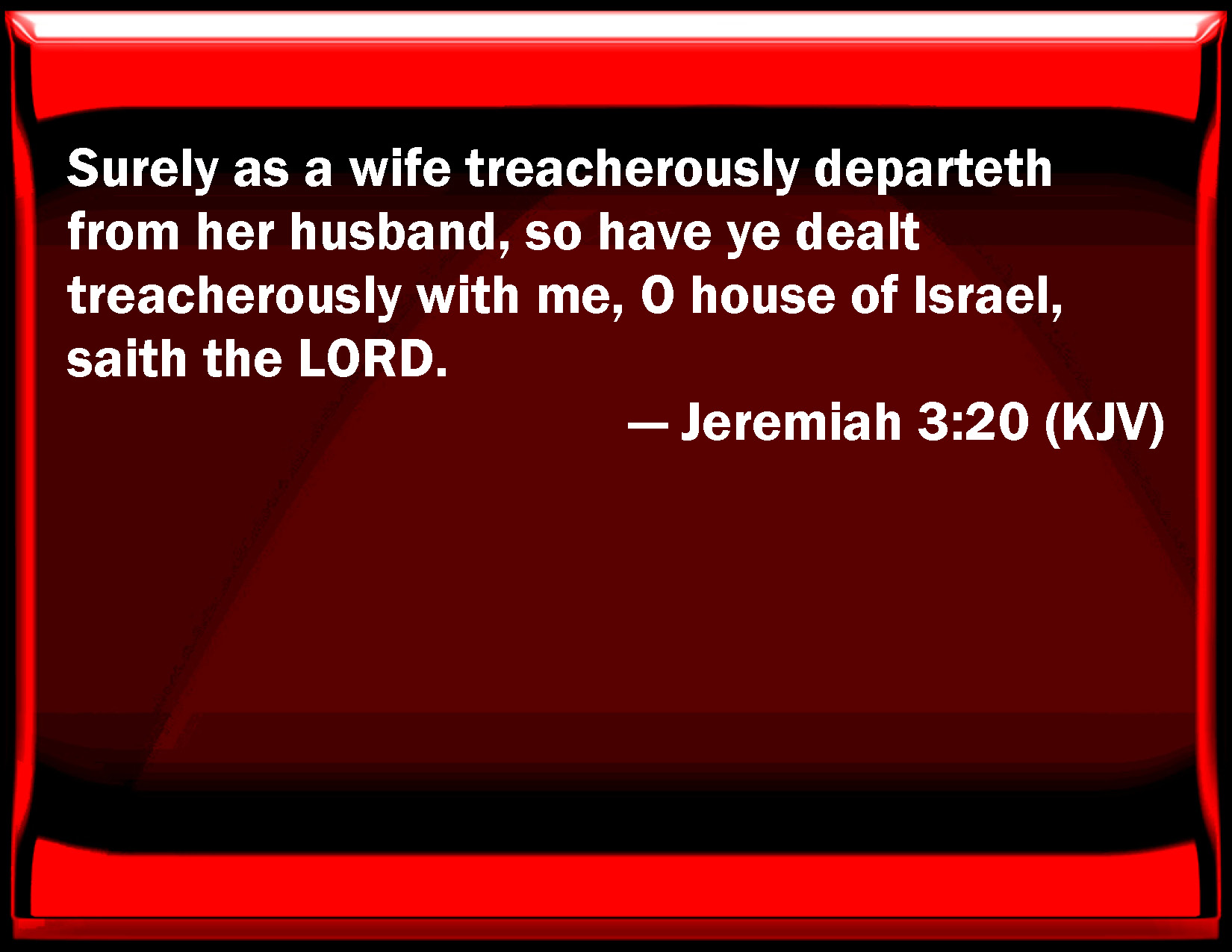 Bible Verse Slide Jeremiah 3:20 Surely as a wife treacherously departs from her husband, so have you dealt treacherously with me, O house of Israel, said the LORD. KJV: Surely as a wife treacherously departeth from her husband, so have ye dealt treacherously with me, O house of Israel, saith the LORD. DRB: But as a woman that despiseth her lover, so hath the house of Israel despised me, saith the Lord. DBT: Surely as a woman treacherously departeth from her companion, so have ye dealt treacherously with me, O house of Israel, saith Jehovah. ERV: Surely as a wife treacherously departeth from her husband, so have ye dealt treacherously with me, O house of Israel, saith the LORD. WBT: Surely as a wife treacherously departeth from her husband, so have ye dealt treacherously with me, O house of Israel, saith the LORD. WEB: "Surely as a wife treacherously departs from her husband, so you have dealt treacherously with me, house of Israel," says Yahweh. YLT: But — a woman hath deceived her friend, So ye have dealt treacherously with Me, O house of Israel, an affirmation of Jehovah.Links Jeremiah 3:20 NIV • Jeremiah 3:20 NLT • Jeremiah 3:20 ESV • Jeremiah 3:20 NASB • Jeremiah 3:20 KJV • Jeremiah 3:20 Interlinear • Jeremiah 3:20 Commentaries • Jeremiah 3:20 Parallel Texts • Jeremiah 3:20 Bible Apps • Jeremiah 3:20 Parallel • Bible Hub |