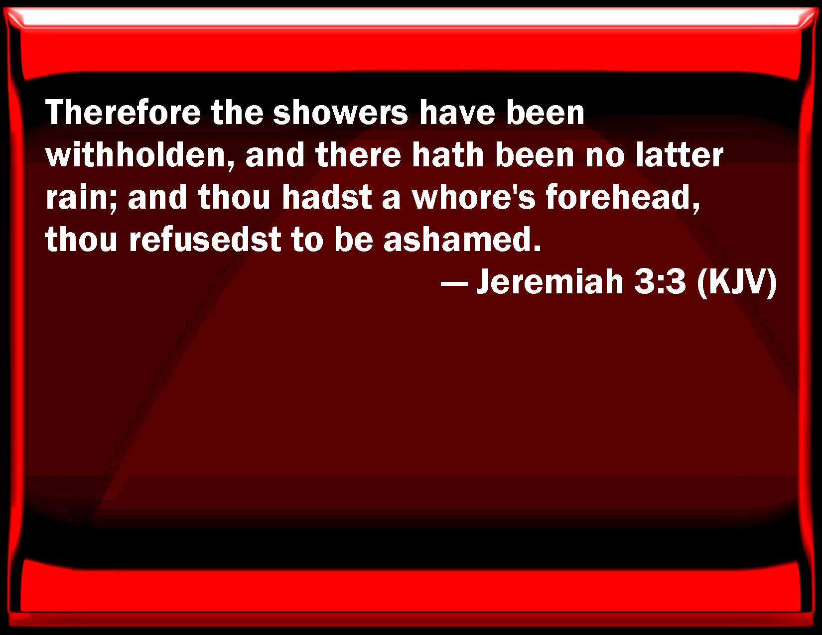 Bible Verse Slide Jeremiah 3:3 Therefore the showers have been withheld, and there has been no latter rain; and you had a whore's forehead, you refused to be ashamed. KJV: Therefore the showers have been withholden, and there hath been no latter rain; and thou hadst a whore's forehead, thou refusedst to be ashamed. DRB: Therefore the showers were withholden, and there was no lateward rain: thou hadst a harlot's forehead, thou wouldst not blush. DBT: And the showers have been withholden, and there hath been no latter rain; but thou hast a harlot's forehead, thou refusest to be ashamed. ERV: Therefore the showers have been withholden, and there hath been no latter rain; yet thou hadst a whore's forehead, thou refusedst to be ashamed. WBT: Therefore the showers have been withheld, and there hath been no latter rain? and thou hadst a harlot's forehead, thou refusedst to be ashamed. WEB: Therefore the showers have been withheld, and there has been no latter rain; yet you have a prostitute's forehead, you refused to be ashamed. YLT: And withheld are showers, and gathered rain hath not been. The forehead of a whorish woman thou hast, Thou hast refused to be ashamed.Links Jeremiah 3:3 NIV • Jeremiah 3:3 NLT • Jeremiah 3:3 ESV • Jeremiah 3:3 NASB • Jeremiah 3:3 KJV • Jeremiah 3:3 Interlinear • Jeremiah 3:3 Commentaries • Jeremiah 3:3 Parallel Texts • Jeremiah 3:3 Bible Apps • Jeremiah 3:3 Parallel • Bible Hub |