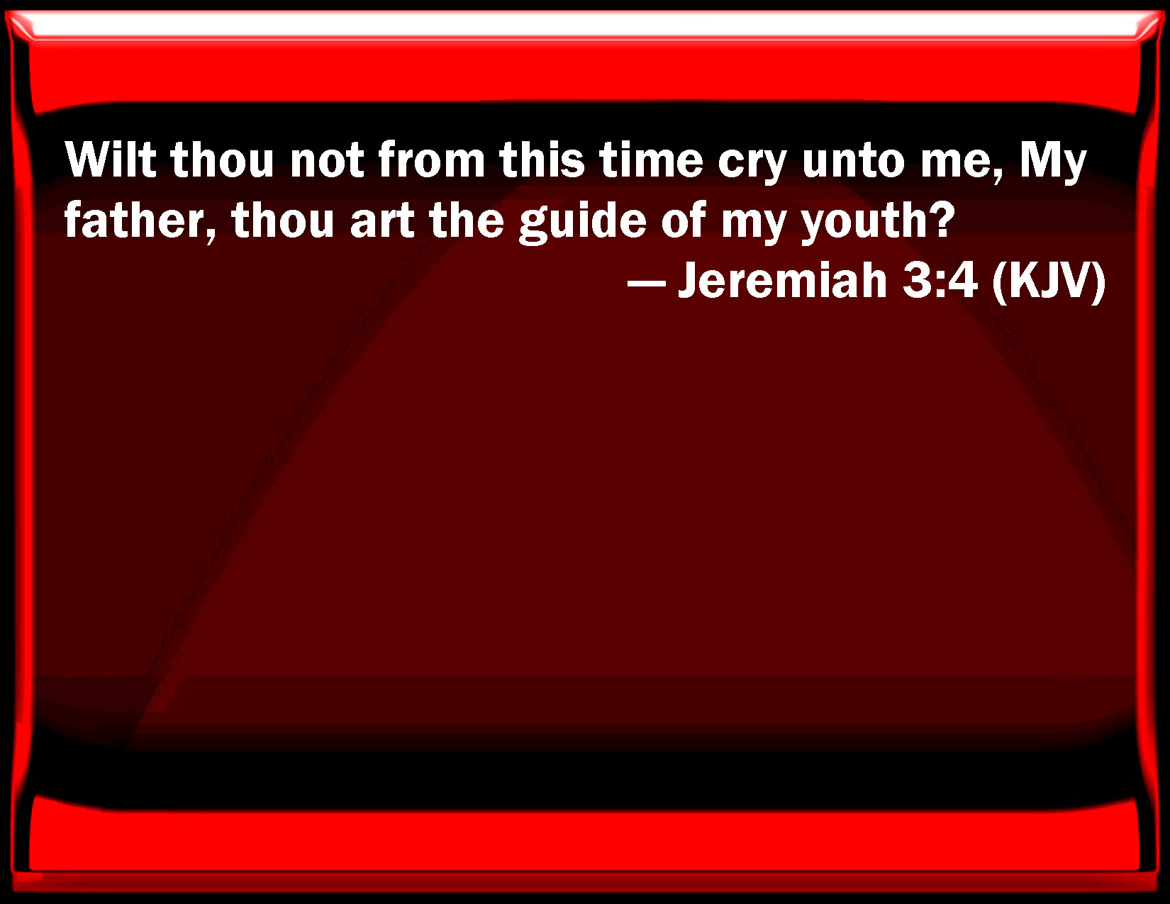 Bible Verse Slide Jeremiah 3:4 Will you not from this time cry to me, My father, you are the guide of my youth? KJV: Wilt thou not from this time cry unto me, My father, thou art the guide of my youth? DRB: Therefore at least at this time call to me: Thou art my father, the guide of my virginity: DBT: Wilt thou not from this time cry unto me, My father, thou art the guide of my youth? ERV: Wilt thou not from this time cry unto me, My father, thou art the guide of my youth? WBT: Wilt thou not from this time cry to me, My father, thou art the guide of my youth? WEB: Will you not from this time cry to me, 'My Father, you are the guide of my youth?' YLT: Hast thou not henceforth called to Me, 'My father, Thou art the leader of my youth?Links Jeremiah 3:4 NIV • Jeremiah 3:4 NLT • Jeremiah 3:4 ESV • Jeremiah 3:4 NASB • Jeremiah 3:4 KJV • Jeremiah 3:4 Interlinear • Jeremiah 3:4 Commentaries • Jeremiah 3:4 Parallel Texts • Jeremiah 3:4 Bible Apps • Jeremiah 3:4 Parallel • Bible Hub |