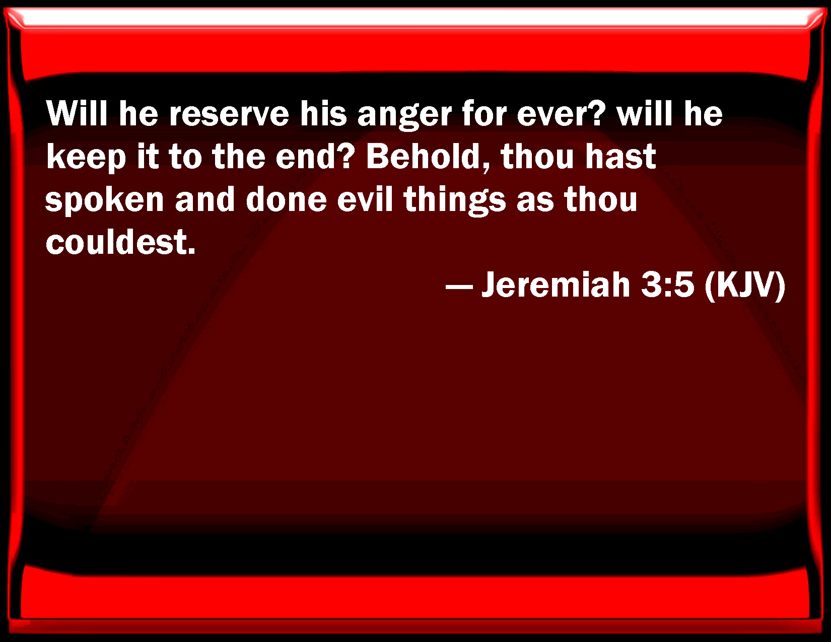 Bible Verse Slide Jeremiah 3:5 Will he reserve his anger for ever? will he keep it to the end? Behold, you have spoken and done evil things as you could. KJV: Will he reserve his anger for ever? will he keep it to the end? Behold, thou hast spoken and done evil things as thou couldest. DRB: Wilt thou be angry for ever, or wilt thou continue until the end? Behold, thou hast spoken, and hast done evil things, and hast been able. DBT: Will he keep his anger for ever? Will he preserve it perpetually? Behold, thou hast spoken and hast done evil things, and thou art so determined. ERV: Will he retain his anger for ever? will he keep it to the end? Behold, thou hast spoken and hast done evil things, and hast had thy way. WBT: Will he retain his anger for ever? will he keep it to the end? Behold, thou hast spoken and done evil things as thou couldst. WEB: "'Will he retain [his anger] forever? Will he keep it to the end?' Behold, you have spoken and have done evil things, and have had your way." YLT: Doth He keep to the age? watch for ever?' Lo, these things thou hast spoken, And thou dost the evil things, and prevailest.Links Jeremiah 3:5 NIV • Jeremiah 3:5 NLT • Jeremiah 3:5 ESV • Jeremiah 3:5 NASB • Jeremiah 3:5 KJV • Jeremiah 3:5 Interlinear • Jeremiah 3:5 Commentaries • Jeremiah 3:5 Parallel Texts • Jeremiah 3:5 Bible Apps • Jeremiah 3:5 Parallel • Bible Hub |