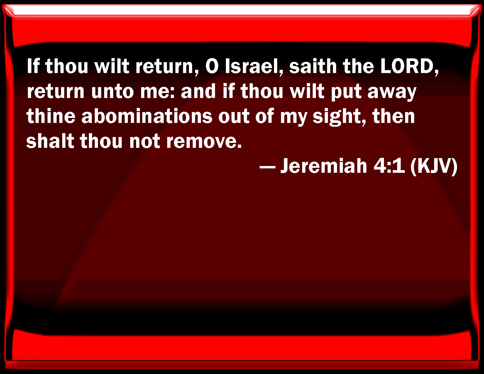 Bible Verse Slide Jeremiah 4:1 If you will return, O Israel, said the LORD, return to me: and if you will put away your abominations out of my sight, then shall you not remove. KJV: If thou wilt return, O Israel, saith the LORD, return unto me: and if thou wilt put away thine abominations out of my sight, then shalt thou not remove. DRB: If thou wilt return, O Israel, saith the Lord, return to me: if thou wilt take away thy stumblingblocks out of my sight, thou shalt not be moved. DBT: If thou wilt return, O Israel, saith Jehovah, return unto me; and if thou wilt put away thine abominations out of my sight, then shalt thou not be a wanderer; ERV: If thou wilt return, O Israel, saith the LORD, unto me shalt thou return: and if thou wilt put away thine abominations out of my sight, then shalt thou not be removed; WBT: If thou wilt return, O Israel, saith the LORD, return to me: and if thou wilt put away thy abominations out of my sight, then shalt thou not remove. WEB: "If you will return, Israel," says Yahweh, "if you will return to me, and if you will put away your abominations out of my sight; then you shall not be removed; YLT: If thou dost turn back, O Israel, An affirmation of Jehovah, unto Me turn back, And if thou dost turn aside Thine abominations from My face, Then thou dost not bemoan.Links Jeremiah 4:1 NIV • Jeremiah 4:1 NLT • Jeremiah 4:1 ESV • Jeremiah 4:1 NASB • Jeremiah 4:1 KJV • Jeremiah 4:1 Interlinear • Jeremiah 4:1 Commentaries • Jeremiah 4:1 Parallel Texts • Jeremiah 4:1 Bible Apps • Jeremiah 4:1 Parallel • Bible Hub |