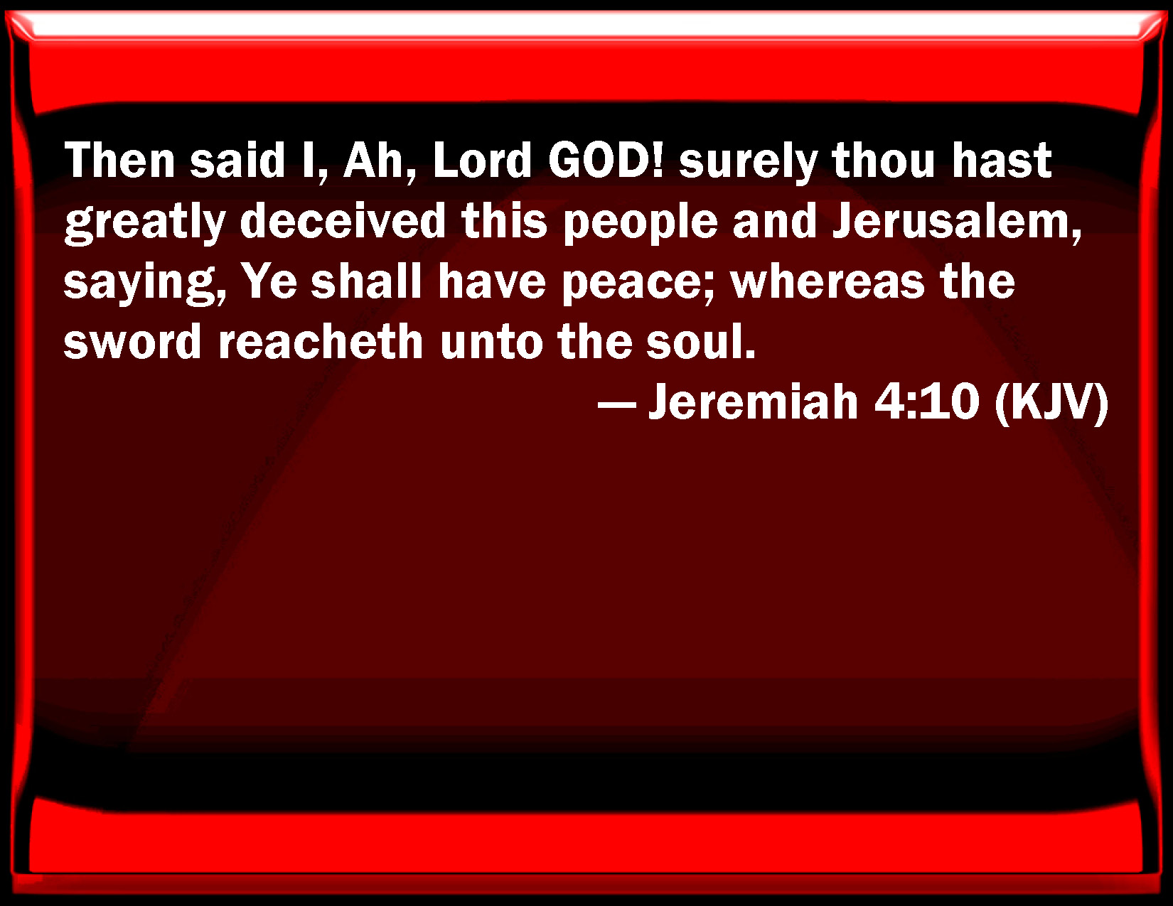 Bible Verse Slide Jeremiah 4:10 Then said I, Ah, Lord GOD! surely you have greatly deceived this people and Jerusalem, saying, You shall have peace; whereas the sword reaches to the soul. KJV: Then said I, Ah, Lord GOD! surely thou hast greatly deceived this people and Jerusalem, saying, Ye shall have peace; whereas the sword reacheth unto the soul. DRB: And I said: Alas, alas, alas, O Lord God, hast thou then deceived this people and Jerusalem, saying: You shall have peace: and behold the sword reacheth even to the soul? DBT: And I said, Alas, Lord Jehovah! surely thou hast greatly deceived this people and Jerusalem, saying, Ye shall have peace; whereas the sword reacheth unto the soul. ERV: Then said I, Ah, Lord GOD! surely thou hast greatly deceived this people and Jerusalem, saying, Ye shall have peace; whereas the sword reacheth unto the soul. WBT: Then said I, Ah, Lord GOD! surely thou hast greatly deceived this people and Jerusalem, saying, Ye shall have peace; whereas the sword reacheth to the soul. WEB: Then I said, "Ah, Lord Yahweh! Surely you have greatly deceived this people and Jerusalem, saying, 'You shall have peace;' whereas the sword reaches to the heart." YLT: And I say, 'Ah, Lord Jehovah, Surely thou hast entirely forgotten this people and Jerusalem, saying, Peace is for you, And struck hath a sword unto the soul!'Links Jeremiah 4:10 NIV • Jeremiah 4:10 NLT • Jeremiah 4:10 ESV • Jeremiah 4:10 NASB • Jeremiah 4:10 KJV • Jeremiah 4:10 Interlinear • Jeremiah 4:10 Commentaries • Jeremiah 4:10 Parallel Texts • Jeremiah 4:10 Bible Apps • Jeremiah 4:10 Parallel • Bible Hub |