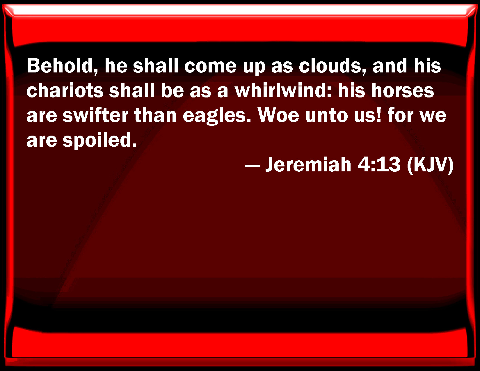 Bible Verse Slide Jeremiah 4:13 Behold, he shall come up as clouds, and his chariots shall be as a whirlwind: his horses are swifter than eagles. Woe to us! for we are spoiled. KJV: Behold, he shall come up as clouds, and his chariots shall be as a whirlwind: his horses are swifter than eagles. Woe unto us! for we are spoiled. DRB: Behold he shall come up as a cloud, and his chariots as a tempest: his horses are swifter than eagles: woe unto us, for we are laid waste. DBT: Behold, he cometh up as clouds, and his chariots are as a whirlwind; his horses are swifter than eagles. Woe unto us! for we are destroyed. ERV: Behold, he shall come up as clouds, and his chariots shall be as the whirlwind: his horses are swifter than eagles. Woe unto us! for we are spoiled. WBT: Behold, he shall come up as clouds, and his chariots shall be as a whirlwind: his horses are swifter than eagles. Woe to us! for we are laid waste. WEB: Behold, he shall come up as clouds, and his chariots [shall be] as the whirlwind: his horses are swifter than eagles. Woe to us! For we are ruined. YLT: Lo, as clouds he cometh up, And as a hurricane his chariots, Lighter than eagles have been his horses, Woe to us, for we have been spoiled.Links Jeremiah 4:13 NIV • Jeremiah 4:13 NLT • Jeremiah 4:13 ESV • Jeremiah 4:13 NASB • Jeremiah 4:13 KJV • Jeremiah 4:13 Interlinear • Jeremiah 4:13 Commentaries • Jeremiah 4:13 Parallel Texts • Jeremiah 4:13 Bible Apps • Jeremiah 4:13 Parallel • Bible Hub |