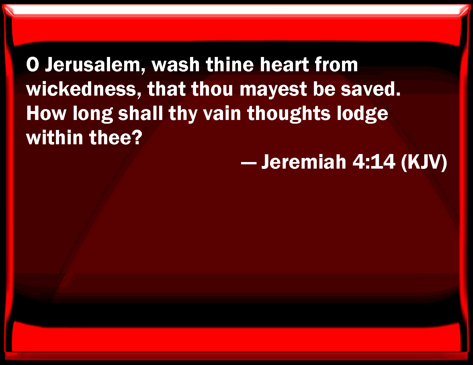 Bible Verse Slide Jeremiah 4:14 O Jerusalem, wash your heart from wickedness, that you may be saved. How long shall your vain thoughts lodge within you? KJV: O Jerusalem, wash thine heart from wickedness, that thou mayest be saved. How long shall thy vain thoughts lodge within thee? DRB: Wash thy heart from wickedness, O Jerusalem, that thou mayst be saved: how long shall hurtful thoughts abide in thee? DBT: Wash thy heart, Jerusalem, from wickedness, that thou mayest be saved. How long shall thy vain thoughts lodge within thee? ERV: O Jerusalem, wash thine heart from wickedness, that thou mayest be saved. How long shall thine evil thoughts lodge within thee? WBT: O Jerusalem, wash thy heart from wickedness, that thou mayest be saved. How long shall thy vain thoughts lodge within thee? WEB: Jerusalem, wash your heart from wickedness, that you may be saved. How long shall your evil thoughts lodge within you? YLT: Wash from evil thy heart, O Jerusalem, That thou mayest be saved, Till when dost thou lodge in thy heart Thoughts of thy strength?Links Jeremiah 4:14 NIV • Jeremiah 4:14 NLT • Jeremiah 4:14 ESV • Jeremiah 4:14 NASB • Jeremiah 4:14 KJV • Jeremiah 4:14 Interlinear • Jeremiah 4:14 Commentaries • Jeremiah 4:14 Parallel Texts • Jeremiah 4:14 Bible Apps • Jeremiah 4:14 Parallel • Bible Hub |