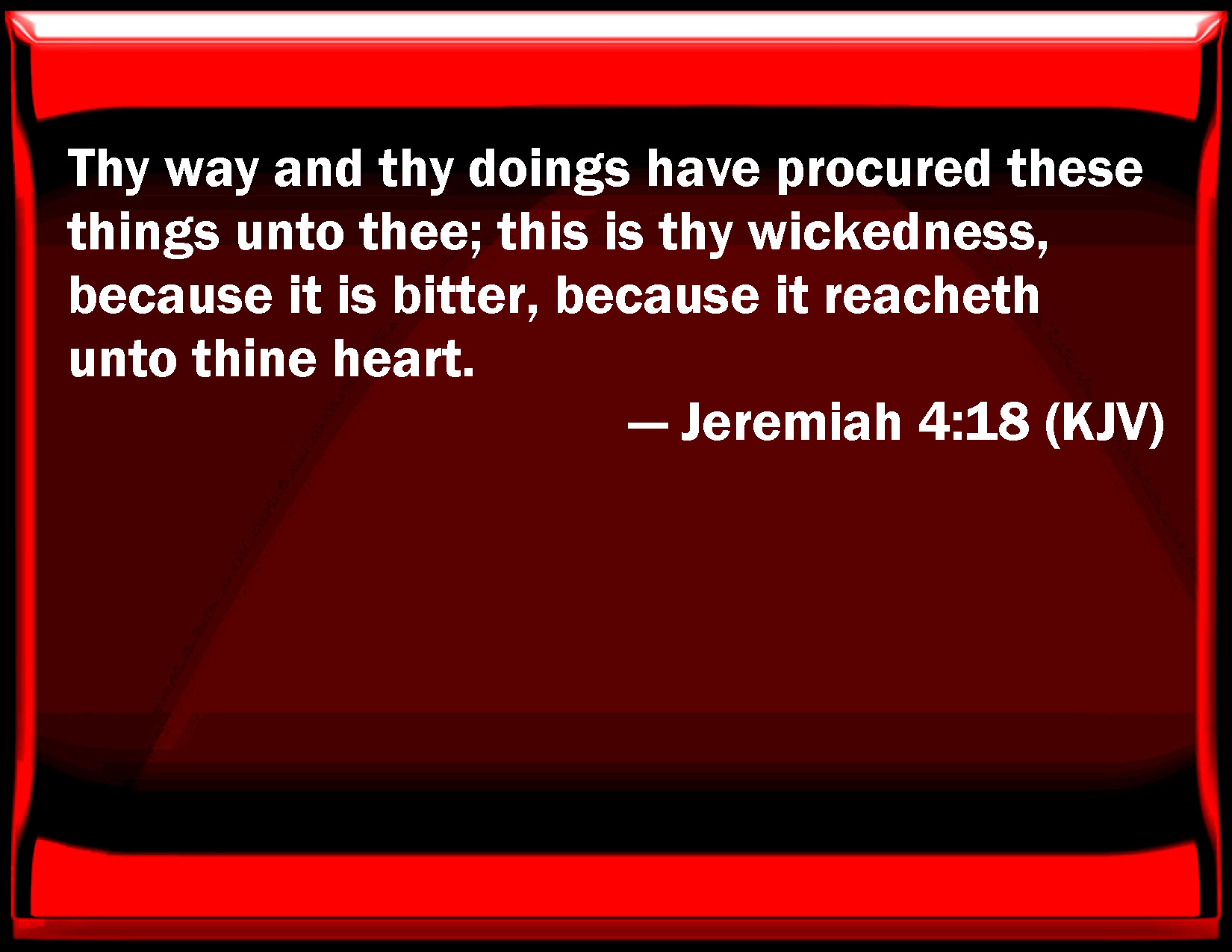 Bible Verse Slide Jeremiah 4:18 Your way and your doings have procured these things to you; this is your wickedness, because it is bitter, because it reaches to your heart. KJV: Thy way and thy doings have procured these things unto thee; this is thy wickedness, because it is bitter, because it reacheth unto thine heart. DRB: Thy ways, and thy devices have brought these things upon thee: this is thy wickedness, because it is bitter, because it hath touched thy heart. DBT: Thy way and thy doings have procured these things unto thee; this is thy wickedness, yea, it is bitter, yea, it reacheth unto thy heart. ERV: Thy way and thy doings have procured these things unto thee; this is thy wickedness; for it is bitter, for it reacheth unto thine heart. WBT: Thy way and thy doings have procured these things to thee; this is thy wickedness, because it is bitter, because it reacheth to thy heart. WEB: "Your way and your doings have brought these things to you. This is your wickedness; for it is bitter, for it reaches to your heart." YLT: Thy way and thy doings have done these to thee, This is thy vexation, for it is bitter, For it hath struck unto thy heart.Links Jeremiah 4:18 NIV • Jeremiah 4:18 NLT • Jeremiah 4:18 ESV • Jeremiah 4:18 NASB • Jeremiah 4:18 KJV • Jeremiah 4:18 Interlinear • Jeremiah 4:18 Commentaries • Jeremiah 4:18 Parallel Texts • Jeremiah 4:18 Bible Apps • Jeremiah 4:18 Parallel • Bible Hub |