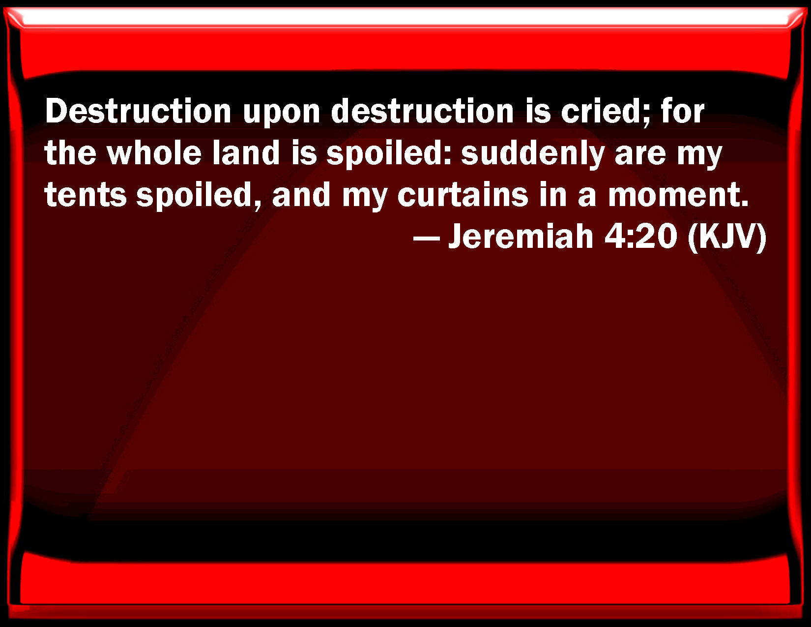 Bible Verse Slide Jeremiah 4:20 Destruction on destruction is cried; for the whole land is spoiled: suddenly are my tents spoiled, and my curtains in a moment. KJV: Destruction upon destruction is cried; for the whole land is spoiled: suddenly are my tents spoiled, and my curtains in a moment. DRB: Destruction upon destruction is called for, and all the earth is laid waste: my tents are destroyed on a sudden, and my pavilions in a moment. DBT: Destruction upon destruction is proclaimed; for the whole land is wasted: suddenly are my tents laid waste, my curtains, in a moment. ERV: Destruction upon destruction is cried; for the whole land is spoiled: suddenly are my tents spoiled, and my curtains in a moment. WBT: Destruction upon destruction is cried; for the whole land is laid waste; suddenly are my tents ruined, and my curtains in a moment. WEB: Destruction on destruction is cried; for the whole land is laid waste: suddenly are my tents destroyed, [and] my curtains in a moment. YLT: Destruction on destruction is proclaimed, For spoiled hath been all the land, Suddenly spoiled have been my tents, In a moment — my curtains.Links Jeremiah 4:20 NIV • Jeremiah 4:20 NLT • Jeremiah 4:20 ESV • Jeremiah 4:20 NASB • Jeremiah 4:20 KJV • Jeremiah 4:20 Interlinear • Jeremiah 4:20 Commentaries • Jeremiah 4:20 Parallel Texts • Jeremiah 4:20 Bible Apps • Jeremiah 4:20 Parallel • Bible Hub |