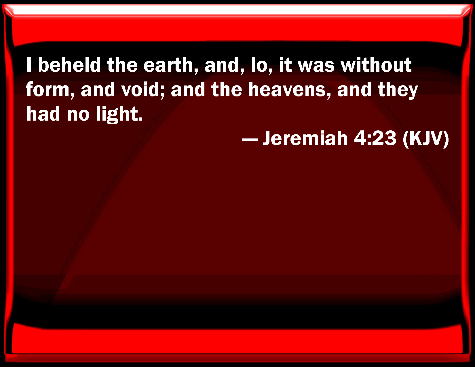 Bible Verse Slide Jeremiah 4:23 I beheld the earth, and, see, it was without form, and void; and the heavens, and they had no light. KJV: I beheld the earth, and, lo, it was without form, and void; and the heavens, and they had no light. DRB: I beheld the earth, and lo it was void, and nothing: and the heavens, and there was no light in them. DBT: I beheld the earth, and lo, it was waste and empty; and the heavens, and they had no light. ERV: I beheld the earth, and, lo, it was waste and void; and the heavens, and they had no light. WBT: I beheld the earth, and lo, it was without form, and void; and the heavens, and they had no light. WEB: I saw the earth, and, behold, it was waste and void; and the heavens, and they had no light. YLT: I looked to the land, and lo, waste and void, And unto the heavens, and their light is not.Links Jeremiah 4:23 NIV • Jeremiah 4:23 NLT • Jeremiah 4:23 ESV • Jeremiah 4:23 NASB • Jeremiah 4:23 KJV • Jeremiah 4:23 Interlinear • Jeremiah 4:23 Commentaries • Jeremiah 4:23 Parallel Texts • Jeremiah 4:23 Bible Apps • Jeremiah 4:23 Parallel • Bible Hub |