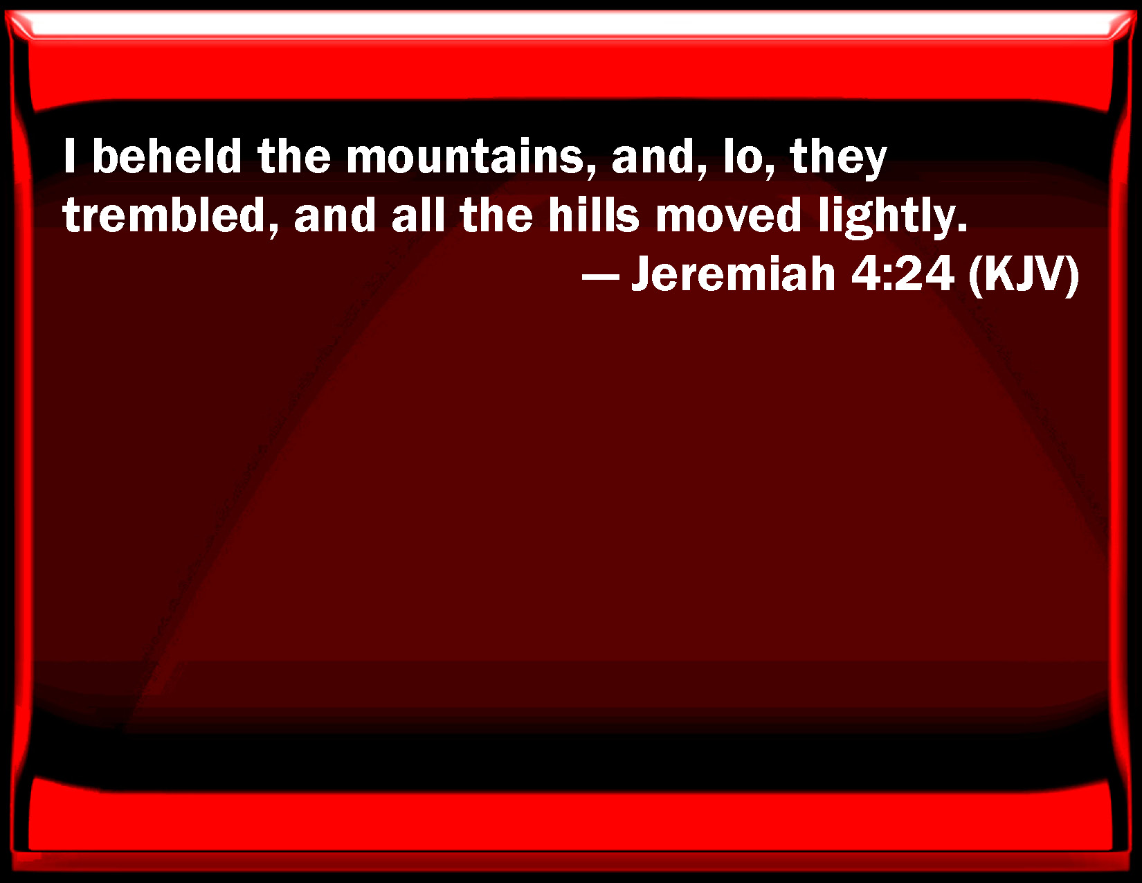 Bible Verse Slide Jeremiah 4:24 I beheld the mountains, and, see, they trembled, and all the hills moved lightly. KJV: I beheld the mountains, and, lo, they trembled, and all the hills moved lightly. DRB: I looked upon the mountains, and behold they trembled: and all the hills were troubled. DBT: I beheld the mountains, and lo, they trembled, and all the hills shook violently. ERV: I beheld the mountains, and, lo, they trembled, and all the hills moved to and fro. WBT: I beheld the mountains, and lo, they trembled, and all the hills moved lightly. WEB: I saw the mountains, and behold, they trembled, and all the hills moved back and forth. YLT: I have looked to the mountains, And lo, they are trembling. And all the hills moved themselves lightly.Links Jeremiah 4:24 NIV • Jeremiah 4:24 NLT • Jeremiah 4:24 ESV • Jeremiah 4:24 NASB • Jeremiah 4:24 KJV • Jeremiah 4:24 Interlinear • Jeremiah 4:24 Commentaries • Jeremiah 4:24 Parallel Texts • Jeremiah 4:24 Bible Apps • Jeremiah 4:24 Parallel • Bible Hub |