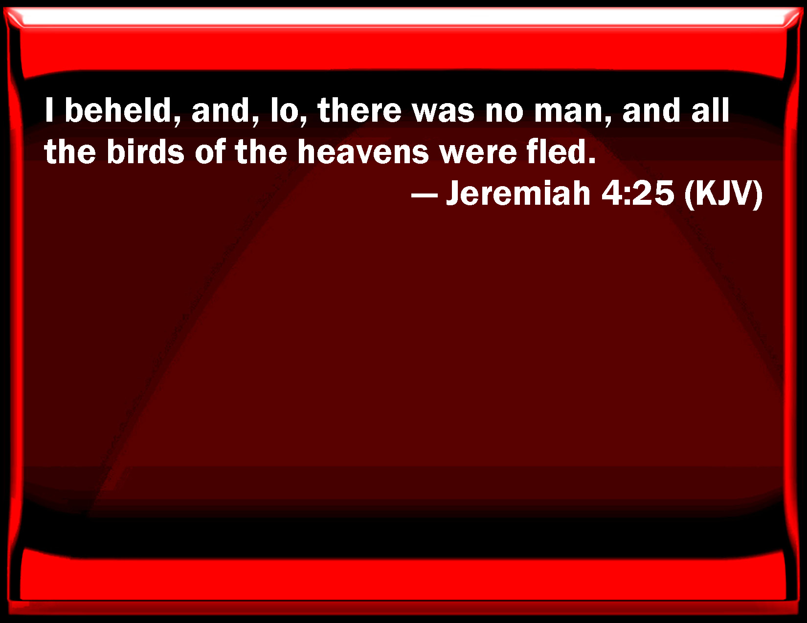 Bible Verse Slide Jeremiah 4:25 I beheld, and, see, there was no man, and all the birds of the heavens were fled. KJV: I beheld, and, lo, there was no man, and all the birds of the heavens were fled. DRB: I beheld, and lo there was no man: and all the birds of the air were gone. DBT: I beheld, and lo, man was not, and all the fowl of the heavens were fled. ERV: I beheld, and, lo, there was no man, and all the birds of the heavens were fled. WBT: I beheld, and lo, there was no man, and all the fowls of the heavens had fled. WEB: I saw, and behold, there was no man, and all the birds of the sky had fled. YLT: I have looked, and lo, man is not, And all fowls of the heavens have fled.Links Jeremiah 4:25 NIV • Jeremiah 4:25 NLT • Jeremiah 4:25 ESV • Jeremiah 4:25 NASB • Jeremiah 4:25 KJV • Jeremiah 4:25 Interlinear • Jeremiah 4:25 Commentaries • Jeremiah 4:25 Parallel Texts • Jeremiah 4:25 Bible Apps • Jeremiah 4:25 Parallel • Bible Hub |
