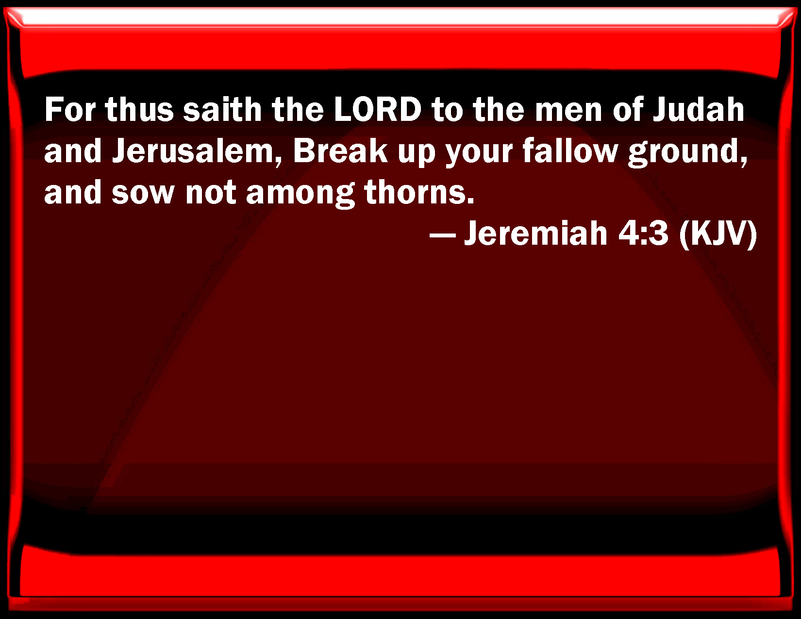 Bible Verse Slide Jeremiah 4:3 For thus said the LORD to the men of Judah and Jerusalem, Break up your fallow ground, and sow not among thorns. KJV: For thus saith the LORD to the men of Judah and Jerusalem, Break up your fallow ground, and sow not among thorns. DRB: For thus saith the Lord to the men of Juda and Jerusalem: Break up anew your fallow ground, and sow not upon thorns: DBT: For thus saith Jehovah to the men of Judah and Jerusalem: Break up for you a fallow ground, and sow not among thorns. ERV: For thus saith the LORD to the men of Judah and to Jerusalem, Break up your fallow ground, and sow not among thorns. WBT: For thus saith the LORD to the men of Judah and Jerusalem, Break up your fallow ground, and sow not among thorns. WEB: For thus says Yahweh to the men of Judah and to Jerusalem, "Break up your fallow ground, and don't sow among thorns. YLT: For thus said Jehovah, To the man of Judah, and to Jerusalem: Till for yourselves tillage, And do not sow unto the thorns.Links Jeremiah 4:3 NIV • Jeremiah 4:3 NLT • Jeremiah 4:3 ESV • Jeremiah 4:3 NASB • Jeremiah 4:3 KJV • Jeremiah 4:3 Interlinear • Jeremiah 4:3 Commentaries • Jeremiah 4:3 Parallel Texts • Jeremiah 4:3 Bible Apps • Jeremiah 4:3 Parallel • Bible Hub |