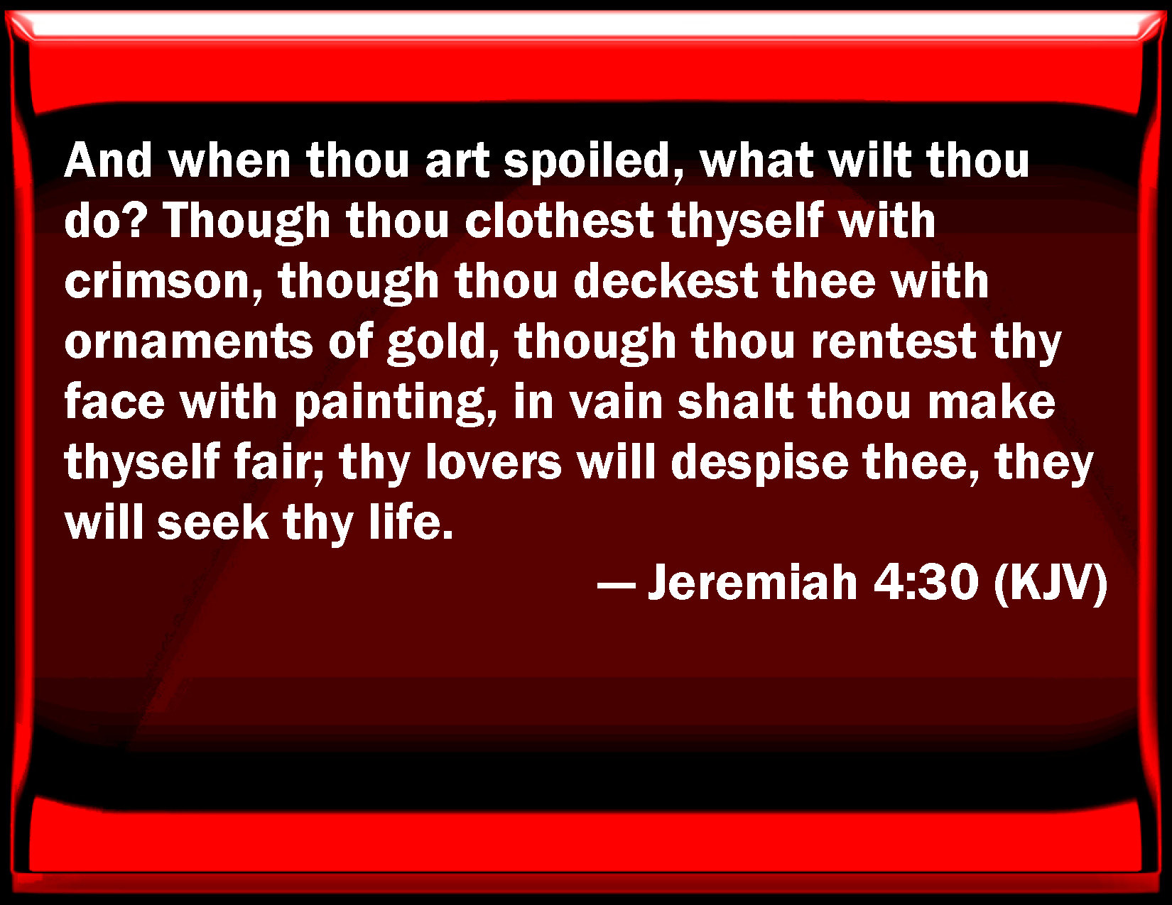 Bible Verse Slide Jeremiah 4:30 And when you are spoiled, what will you do? Though you clothe yourself with crimson, though you deck you with ornaments of gold, though you rend your face with painting, in vain shall you make yourself fair; your lovers will despise you, they will seek your life. KJV: And when thou art spoiled, what wilt thou do? Though thou clothest thyself with crimson, though thou deckest thee with ornaments of gold, though thou rentest thy face with painting, in vain shalt thou make thyself fair; thy lovers will despise thee, they will seek thy life. DRB: But when thou art spoiled what wilt thou do? though thou deckest thee with ornaments of gold, and paintest thy eyes with stibic stone, thou shalt dress thyself out in vain: thy lovers have despised thee, they will seek thy life. DBT: And thou, wasted one, what wilt thou do? Though thou clothest thyself with crimson, though thou deckest thee with ornaments of gold, though thou rendest thine eyes with paint, in vain dost thou make thyself fair: thy lovers despise thee, they seek th ERV: And thou, when thou art spoiled, what wilt thou do? Though thou clothest thyself with scarlet, though thou deckest thee with ornaments of gold, though thou enlargest thine eyes with paint, in vain dost thou make thyself fair; thy lovers despise thee, they seek thy life. WBT: And when thou art laid waste, what wilt thou do? Though thou clothest thyself with crimson, though thou deckest thee with ornaments of gold, though thou rendest thy face with painting, in vain shalt thou make thyself fair: thy lovers will despise thee, they will seek thy life. WEB: You, when you are made desolate, what will you do? Though you clothe yourself with scarlet, though you deck you with ornaments of gold, though you enlarge your eyes with paint, in vain do you make yourself beautiful; [your] lovers despise you, they seek your life. YLT: And thou, O spoiled one, what dost thou? For thou puttest on scarlet, For thou adornest thyself with ornaments of gold. For thou rendest with pain thine eyes, In vain thou dost make thyself fair, Kicked against thee have doting ones, Thy life they do seek.Links Jeremiah 4:30 NIV • Jeremiah 4:30 NLT • Jeremiah 4:30 ESV • Jeremiah 4:30 NASB • Jeremiah 4:30 KJV • Jeremiah 4:30 Interlinear • Jeremiah 4:30 Commentaries • Jeremiah 4:30 Parallel Texts • Jeremiah 4:30 Bible Apps • Jeremiah 4:30 Parallel • Bible Hub |