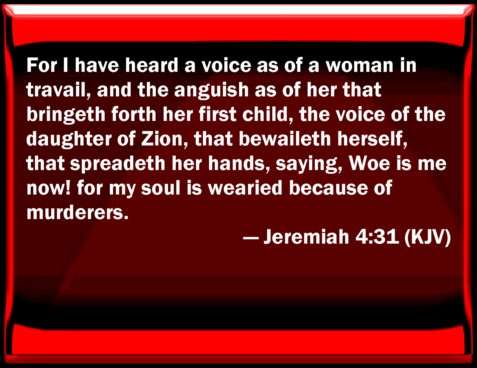 Bible Verse Slide Jeremiah 4:31 For I have heard a voice as of a woman in travail, and the anguish as of her that brings forth her first child, the voice of the daughter of Zion, that mourns herself, that spreads her hands, saying, Woe is me now! for my soul is wearied because of murderers. KJV: For I have heard a voice as of a woman in travail, and the anguish as of her that bringeth forth her first child, the voice of the daughter of Zion, that bewaileth herself, that spreadeth her hands, saying, Woe is me now! for my soul is wearied because of murderers. DRB: For I have heard the voice as of a woman in travail, anguishes as of a woman in labor of a child. The voice of the daughter of Sion, dying away, spreading her hands: Woe is me, for my soul hath fainted because of them that are slain. DBT: For I hear a voice, as of a woman in travail, anguish as of her that bringeth forth her first child, the voice of the daughter of Zion: she moaneth, she spreadeth forth her hands, saying, Woe unto me! for my soul faileth because of murderers. ERV: For I have heard a voice as of a woman in travail, the anguish as of her that bringeth forth her first child, the voice of the daughter of Zion, that gaspeth for breath, that spreadeth her hands, saying, Woe is me now! for my soul fainteth before the murderers. WBT: For I have heard a voice as of a woman in travail, and the anguish as of her that bringeth forth her first child, the voice of the daughter of Zion, that bewaileth herself, that spreadeth her hands, saying, Woe is me now! for my soul is wearied because of murderers. WEB: For I have heard a voice as of a woman in travail, the anguish as of her who brings forth her first child, the voice of the daughter of Zion, who gasps for breath, who spreads her hands, [saying], "Woe is me now! For my soul faints before the murderers." YLT: For a voice as of a sick woman I have heard, Distress, as of one bringing forth a first-born, The voice of the daughter of Zion, She bewaileth herself, she spreadeth out her hands, 'Woe to me now, for weary is my soul of slayers!'Links Jeremiah 4:31 NIV • Jeremiah 4:31 NLT • Jeremiah 4:31 ESV • Jeremiah 4:31 NASB • Jeremiah 4:31 KJV • Jeremiah 4:31 Interlinear • Jeremiah 4:31 Commentaries • Jeremiah 4:31 Parallel Texts • Jeremiah 4:31 Bible Apps • Jeremiah 4:31 Parallel • Bible Hub |