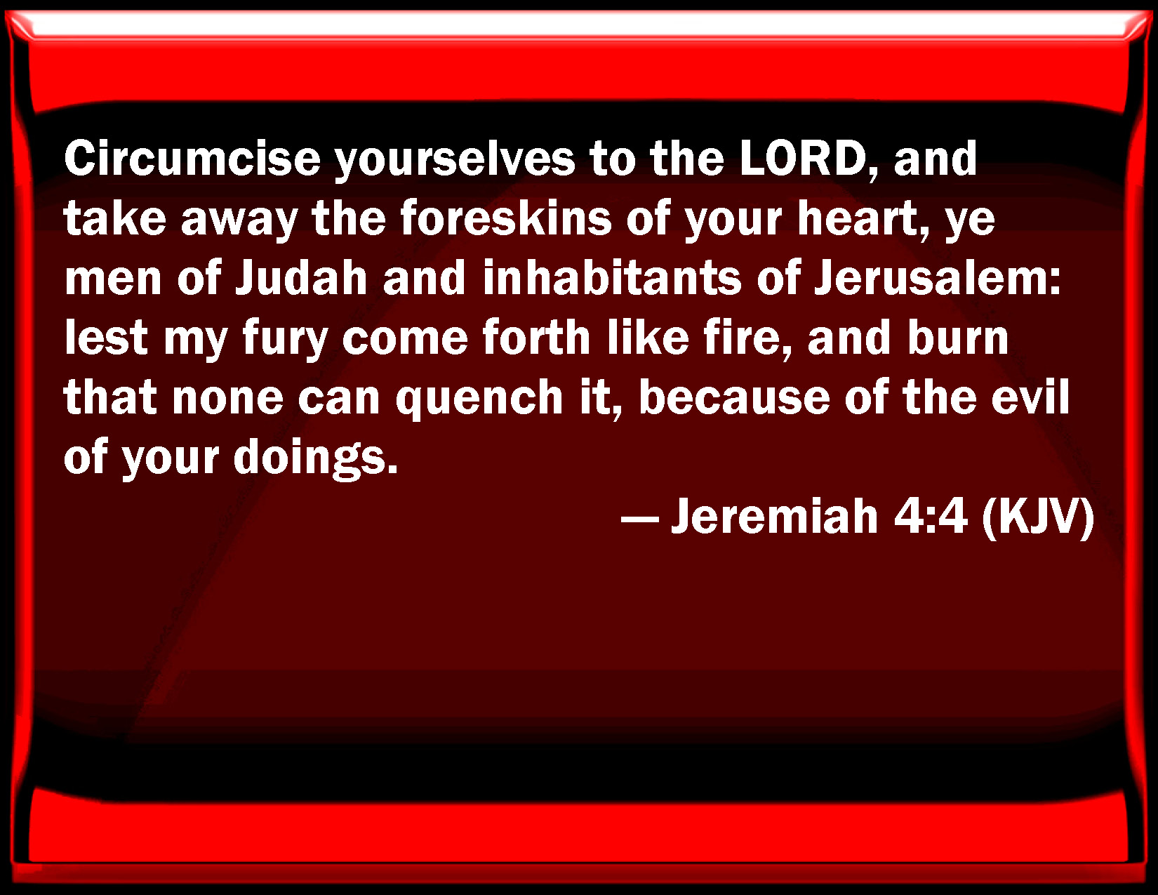 Bible Verse Slide Jeremiah 4:4 Circumcise yourselves to the LORD, and take away the foreskins of your heart, you men of Judah and inhabitants of Jerusalem: lest my fury come forth like fire, and burn that none can quench it, because of the evil of your doings. KJV: Circumcise yourselves to the LORD, and take away the foreskins of your heart, ye men of Judah and inhabitants of Jerusalem: lest my fury come forth like fire, and burn that none can quench it, because of the evil of your doings. DRB: Be circumcised to the Lord, and take away the foreskins of your hearts, ye men of Juda, and ye inhabitants of Jerusalem: lest my indignation come forth like fire, and burn, and there be none that can quench it: because of the wickedness of your thoughts. DBT: Circumcise yourselves for Jehovah, and take away the foreskins of your heart, ye men of Judah and inhabitants of Jerusalem; lest my fury come forth like fire and burn, and there be none to quench it, because of the evil of your doings. ERV: Circumcise yourselves to the LORD, and take away the foreskins of your heart, ye men of Judah and inhabitants of Jerusalem: lest my fury go forth like fire, and burn that none can quench it, because of the evil of your doings. WBT: Circumcise yourselves to the LORD, and take away the foreskins of your heart, ye men of Judah and inhabitants of Jerusalem: lest my fury come forth like fire, and burn that none can quench it, because of the evil of your doings. WEB: Circumcise yourselves to Yahweh, and take away the foreskins of your heart, you men of Judah and inhabitants of Jerusalem; lest my wrath go forth like fire, and burn so that none can quench it, because of the evil of your doings. YLT: Be circumcised to Jehovah, And turn aside the foreskins of your heart, O man of Judah, and ye inhabitants of Jerusalem, Lest My fury go out as fire, and hath burned, And there is none quenching, Because of the evil of your doings.Links Jeremiah 4:4 NIV • Jeremiah 4:4 NLT • Jeremiah 4:4 ESV • Jeremiah 4:4 NASB • Jeremiah 4:4 KJV • Jeremiah 4:4 Interlinear • Jeremiah 4:4 Commentaries • Jeremiah 4:4 Parallel Texts • Jeremiah 4:4 Bible Apps • Jeremiah 4:4 Parallel • Bible Hub |