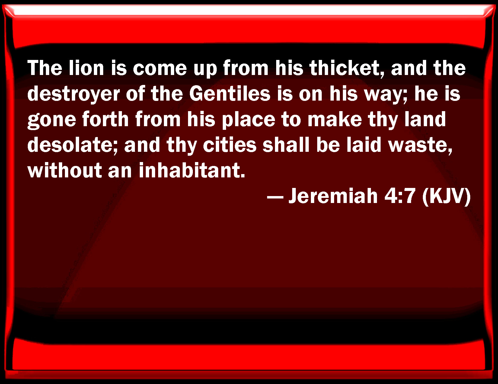 Bible Verse Slide Jeremiah 4:7 The lion is come up from his thicket, and the destroyer of the Gentiles is on his way; he is gone forth from his place to make your land desolate; and your cities shall be laid waste, without an inhabitant. KJV: The lion is come up from his thicket, and the destroyer of the Gentiles is on his way; he is gone forth from his place to make thy land desolate; and thy cities shall be laid waste, without an inhabitant. DRB: The lion is come up out of his den, and the robber of nations hath roused himself: he is come forth out of his place, to make thy land desolate: thy cities shall be laid waste, remaining without an inhabitant. DBT: The lion is come up from his thicket, the destroyer of the nations is on his way; he is gone forth from his place, to make thy land desolate; thy cities shall be laid waste, without inhabitant. ERV: A lion is gone up from his thicket, and a destroyer of nations; he is on his way, he is gone forth from his place; to make thy land desolate, that thy cities be laid waste, without inhabitant. WBT: The lion is come up from his thicket, and the destroyer of the Gentiles is on his way; he is gone forth from his place to make thy land desolate; thy cities shall be laid waste, without an inhabitant. WEB: A lion is gone up from his thicket, and a destroyer of nations; he is on his way, he is gone forth from his place, to make your land desolate, that your cities be laid waste, without inhabitant. YLT: Gone up hath a lion from his thicket, And a destroyer of nations hath journeyed, He hath come forth from his place To make thy land become a desolation, Thy cities are laid waste, without inhabitant.Links Jeremiah 4:7 NIV • Jeremiah 4:7 NLT • Jeremiah 4:7 ESV • Jeremiah 4:7 NASB • Jeremiah 4:7 KJV • Jeremiah 4:7 Interlinear • Jeremiah 4:7 Commentaries • Jeremiah 4:7 Parallel Texts • Jeremiah 4:7 Bible Apps • Jeremiah 4:7 Parallel • Bible Hub |