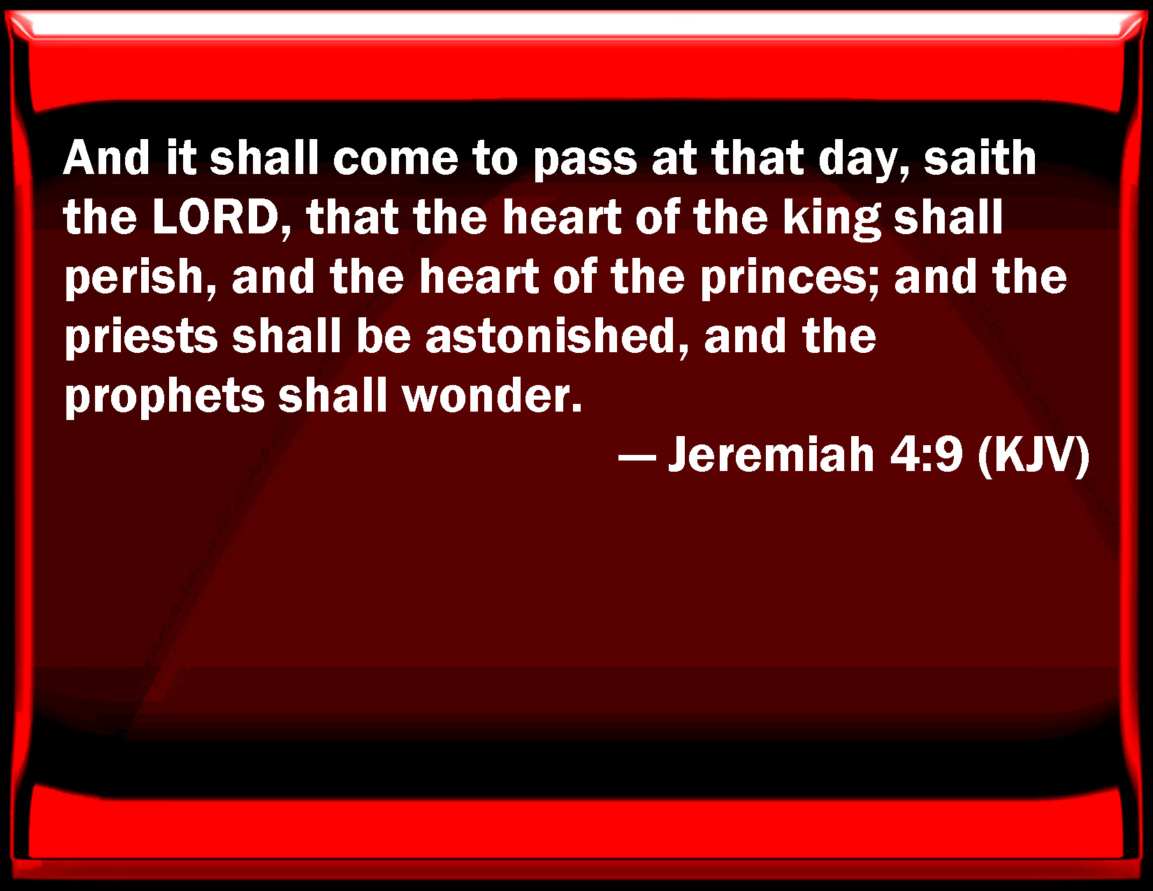Bible Verse Slide Jeremiah 4:9 And it shall come to pass at that day, said the LORD, that the heart of the king shall perish, and the heart of the princes; and the priests shall be astonished, and the prophets shall wonder. KJV: And it shall come to pass at that day, saith the LORD, that the heart of the king shall perish, and the heart of the princes; and the priests shall be astonished, and the prophets shall wonder. DRB: And it shall come to pass in that day, saith the Lord: That the heart of the king shall perish, and the heart of the princes: and the priests shall be astonished, and the prophets shall be amazed DBT: And it shall come to pass in that day, saith Jehovah, that the heart of the king shall perish, and the heart of the princes; and the priests shall be astonished, and the prophets shall be amazed. ERV: And it shall come to pass at that day, saith the LORD, that the heart of the king shall perish, and the heart of the princes; and the priests shall be astonished, and the prophets shall wonder. WBT: And it shall come to pass at that day, saith the LORD, that the heart of the king shall perish, and the heart of the princes; and the priests shall be astonished, and the prophets shall wonder. WEB: "It shall happen at that day," says Yahweh, "that the heart of the king shall perish, and the heart of the princes; and the priests shall be astonished, and the prophets shall wonder." YLT: And it hath come to pass, in that day, An affirmation of Jehovah: 'Perish doth the heart of the king, And the heart of the princes, And astonished have been the priests, And the prophets do wonder.'Links Jeremiah 4:9 NIV • Jeremiah 4:9 NLT • Jeremiah 4:9 ESV • Jeremiah 4:9 NASB • Jeremiah 4:9 KJV • Jeremiah 4:9 Interlinear • Jeremiah 4:9 Commentaries • Jeremiah 4:9 Parallel Texts • Jeremiah 4:9 Bible Apps • Jeremiah 4:9 Parallel • Bible Hub |