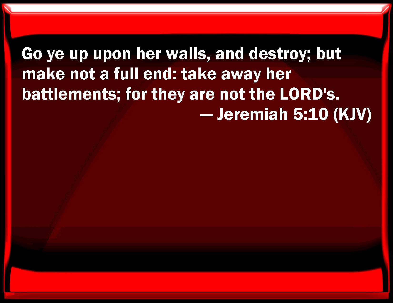 Bible Verse Slide Jeremiah 5:10 Go you up on her walls, and destroy; but make not a full end: take away her battlements; for they are not the LORD's. KJV: Go ye up upon her walls, and destroy; but make not a full end: take away her battlements; for they are not the LORD'S. DRB: Scale down the walls thereof, and throw them down, but do not utterly destroy: take away the branches thereof, because they are not the Lord's. DBT: Go up upon her walls, and destroy; but make not a full end; take away her battlements, for they are not Jehovah's. ERV: Go ye up upon her walls, and destroy; but make not a full end: take away her branches: for they are not the LORD'S. WBT: Go ye up upon her walls, and destroy; but make not a full end: take away her battlements; for they are not the LORD'S. WEB: "Go up on her walls, and destroy; but don't make a full end. Take away her branches; for they are not Yahweh's. YLT: Go ye up on her walls, and destroy, And a completion make not, Turn aside her branches, for they are not Jehovah's,Links Jeremiah 5:10 NIV • Jeremiah 5:10 NLT • Jeremiah 5:10 ESV • Jeremiah 5:10 NASB • Jeremiah 5:10 KJV • Jeremiah 5:10 Interlinear • Jeremiah 5:10 Commentaries • Jeremiah 5:10 Parallel Texts • Jeremiah 5:10 Bible Apps • Jeremiah 5:10 Parallel • Bible Hub |