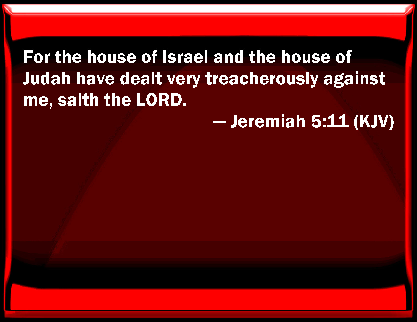 Bible Verse Slide Jeremiah 5:11 For the house of Israel and the house of Judah have dealt very treacherously against me, said the LORD. KJV: For the house of Israel and the house of Judah have dealt very treacherously against me, saith the LORD. DRB: For the house of Israel, and the house of Juda have greatly transgressed against me, saith the Lord. DBT: For the house of Israel and the house of Judah have dealt very treacherously against me, saith Jehovah. ERV: For the house of Israel and the house of Judah have dealt very treacherously against me, saith the LORD. WBT: For the house of Israel and the house of Judah have dealt very treacherously against me, saith the LORD. WEB: For the house of Israel and the house of Judah have dealt very treacherously against me," says Yahweh. YLT: For dealt treacherously against Me have the house of Israel, And the house of Judah, an affirmation of Jehovah.Links Jeremiah 5:11 NIV • Jeremiah 5:11 NLT • Jeremiah 5:11 ESV • Jeremiah 5:11 NASB • Jeremiah 5:11 KJV • Jeremiah 5:11 Interlinear • Jeremiah 5:11 Commentaries • Jeremiah 5:11 Parallel Texts • Jeremiah 5:11 Bible Apps • Jeremiah 5:11 Parallel • Bible Hub |
