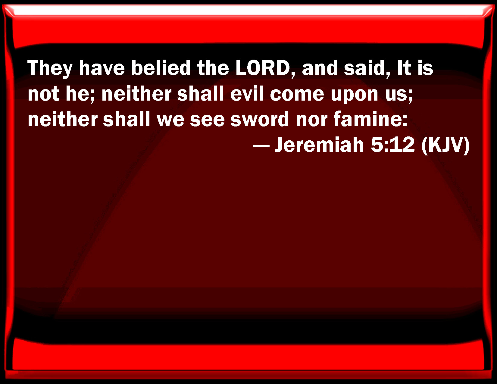 Bible Verse Slide Jeremiah 5:12 They have belied the LORD, and said, It is not he; neither shall evil come on us; neither shall we see sword nor famine: KJV: They have belied the LORD, and said, It is not he; neither shall evil come upon us; neither shall we see sword nor famine: DRB: They have denied the Lord, and said, It is not he: and the evil shall not come upon us: we shall not see the sword and famine. DBT: They have denied Jehovah, and say, He is not; and evil shall not come upon us, nor shall we see sword nor famine; ERV: They have denied the LORD, and said, It is not he; neither shall evil come upon us; neither shall we see sword nor famine: WBT: They have belied the LORD, and said, It is not he; neither shall evil come upon us; neither shall we see sword nor famine: WEB: They have denied Yahweh, and said, "It is not he; neither shall evil come on us; neither shall we see sword nor famine. YLT: They have lied against Jehovah, And they say, 'It is not He, Nor come in against us doth evil, Yea, sword and famine we do not see.Links Jeremiah 5:12 NIV • Jeremiah 5:12 NLT • Jeremiah 5:12 ESV • Jeremiah 5:12 NASB • Jeremiah 5:12 KJV • Jeremiah 5:12 Interlinear • Jeremiah 5:12 Commentaries • Jeremiah 5:12 Parallel Texts • Jeremiah 5:12 Bible Apps • Jeremiah 5:12 Parallel • Bible Hub |