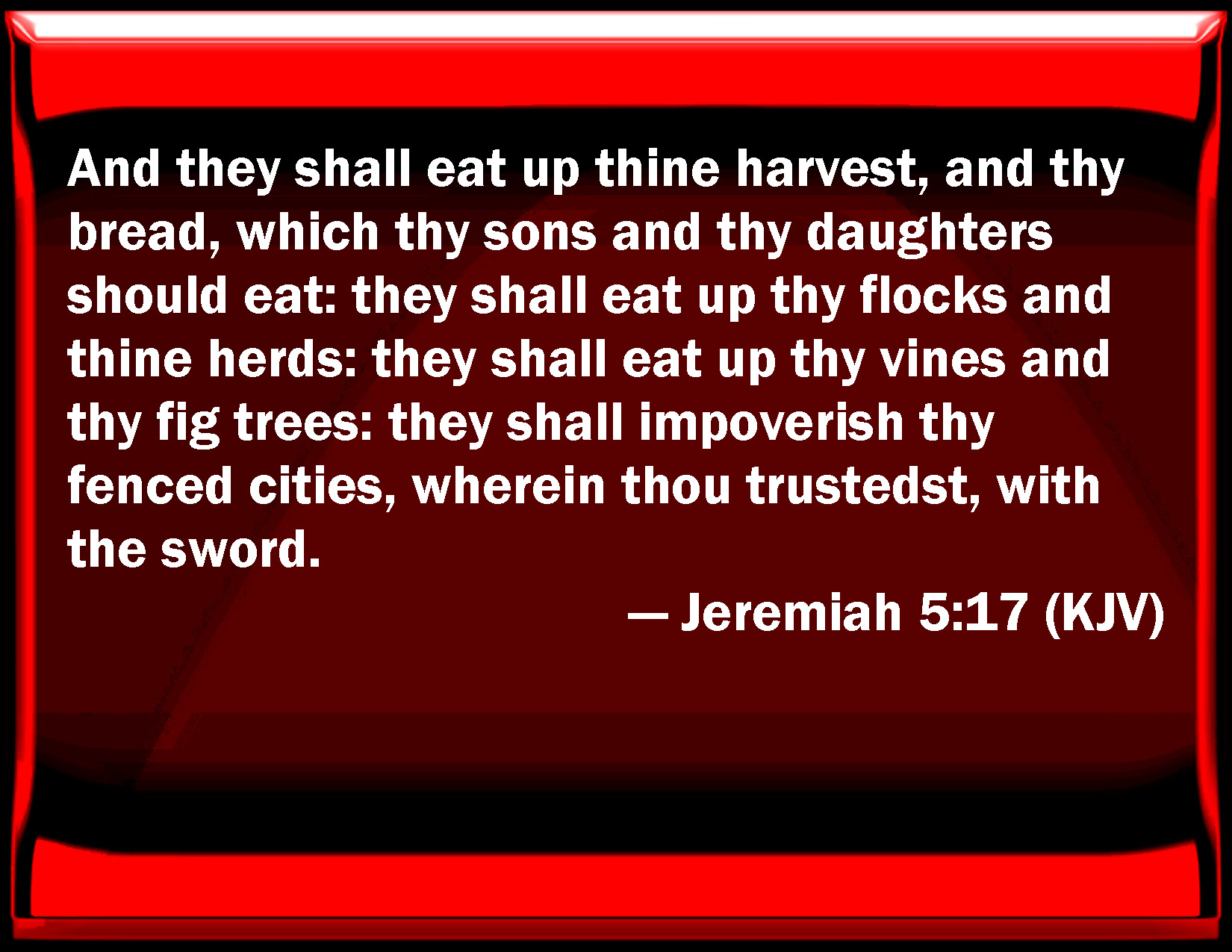 Bible Verse Slide Jeremiah 5:17 And they shall eat up your harvest, and your bread, which your sons and your daughters should eat: they shall eat up your flocks and your herds: they shall eat up your vines and your fig trees: they shall impoverish your fenced cities, wherein you trusted, with the sword. KJV: And they shall eat up thine harvest, and thy bread, which thy sons and thy daughters should eat: they shall eat up thy flocks and thine herds: they shall eat up thy vines and thy fig trees: they shall impoverish thy fenced cities, wherein thou trustedst, with the sword. DRB: And they shall eat up thy corn, and thy bread: they shall devour thy sons, and thy daughters: they shall eat up thy flocks, and thy herds: they shall eat thy vineyards, and thy figs: and with the sword they shall destroy thy strong cities, wherein thou trustest. DBT: And they shall eat up thy harvest and thy bread, they shall eat up thy sons and thy daughters, they shall eat up thy flocks and thy herds, they shall eat up thy vines and thy fig-trees; they shall destroy with the sword thy strong cities, wherein thou trustedst. ERV: And they shall eat up thine harvest and thy bread, which thy sons and thy daughters should eat: they shall eat up thy flocks and thine herds: they shall eat up thy vines and thy fig trees: they shall beat down thy fenced cities, wherein thou trustest, with the sword. WBT: And they shall eat up thy harvest, and thy bread, which thy sons and thy daughters should eat: they shall eat up thy flocks and thy herds: they shall eat up thy vines and thy fig-trees: they shall impoverish with the sword thy fortified cities, in which thou hast trusted. WEB: They shall eat up your harvest, and your bread, [which] your sons and your daughters should eat. They shall eat up your flocks and your herds. They shall eat up your vines and your fig trees. They shall beat down your fortified cities, in which you trust, with the sword. YLT: And it hath consumed thy harvest and thy bread, They consume thy sons, and thy daughters, It consumeth thy flock, and thy herd, It consumeth thy vine, and thy fig-tree, It maketh poor thy fenced cities, In which thou art trusting — by the sword.Links Jeremiah 5:17 NIV • Jeremiah 5:17 NLT • Jeremiah 5:17 ESV • Jeremiah 5:17 NASB • Jeremiah 5:17 KJV • Jeremiah 5:17 Interlinear • Jeremiah 5:17 Commentaries • Jeremiah 5:17 Parallel Texts • Jeremiah 5:17 Bible Apps • Jeremiah 5:17 Parallel • Bible Hub |