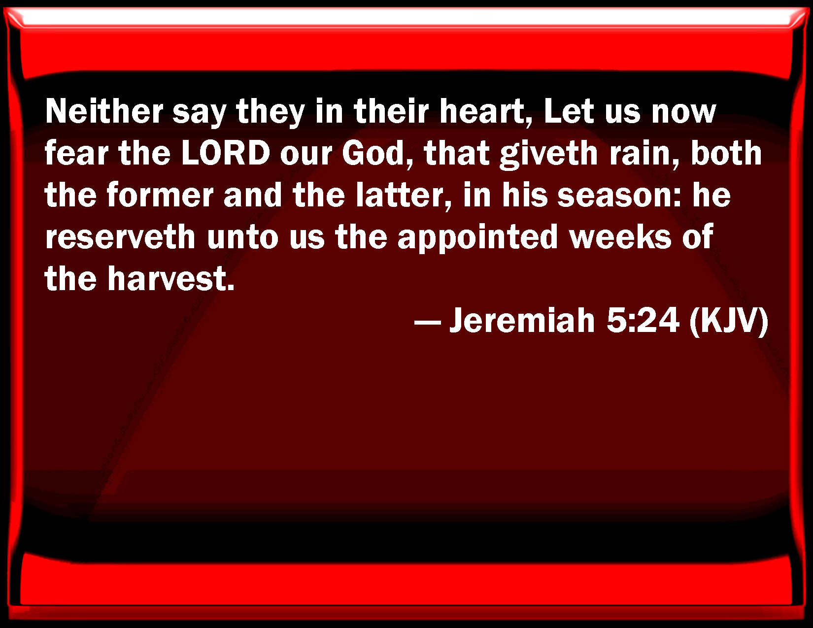 Bible Verse Slide Jeremiah 5:24 Neither say they in their heart, Let us now fear the LORD our God, that gives rain, both the former and the latter, in his season: he reserves to us the appointed weeks of the harvest. KJV: Neither say they in their heart, Let us now fear the LORD our God, that giveth rain, both the former and the latter, in his season: he reserveth unto us the appointed weeks of the harvest. DRB: And they have not said in their heart: let us fear the Lord our God, who giveth us the early and the latter rain in due season: who preserveth for us the fullness of the yearly harvest. DBT: And they say not in their heart, Let us now fear Jehovah our God, that giveth rain, both the early and the latter, in its season; who preserveth unto us the appointed weeks of harvest. ERV: Neither say they in their heart, Let us now fear the LORD our God, that giveth rain, both the former and the latter, in its season; that reserveth unto us the appointed weeks of the harvest. WBT: Neither say they in their heart, Let us now fear the LORD our God, that giveth rain, both the former and the latter, in its season: he reserveth to us the appointed weeks of harvest. WEB: Neither do they say in their heart, 'Let us now fear Yahweh our God, who gives rain, both the former and the latter, in its season; who preserves to us the appointed weeks of the harvest.' YLT: And they have not said in their heart, 'Let us fear, we pray you, Jehovah our God, who is giving rain, The sprinkling and the gathered, in its season, The appointed weeks of harvest He keepeth for us.'Links Jeremiah 5:24 NIV • Jeremiah 5:24 NLT • Jeremiah 5:24 ESV • Jeremiah 5:24 NASB • Jeremiah 5:24 KJV • Jeremiah 5:24 Interlinear • Jeremiah 5:24 Commentaries • Jeremiah 5:24 Parallel Texts • Jeremiah 5:24 Bible Apps • Jeremiah 5:24 Parallel • Bible Hub |