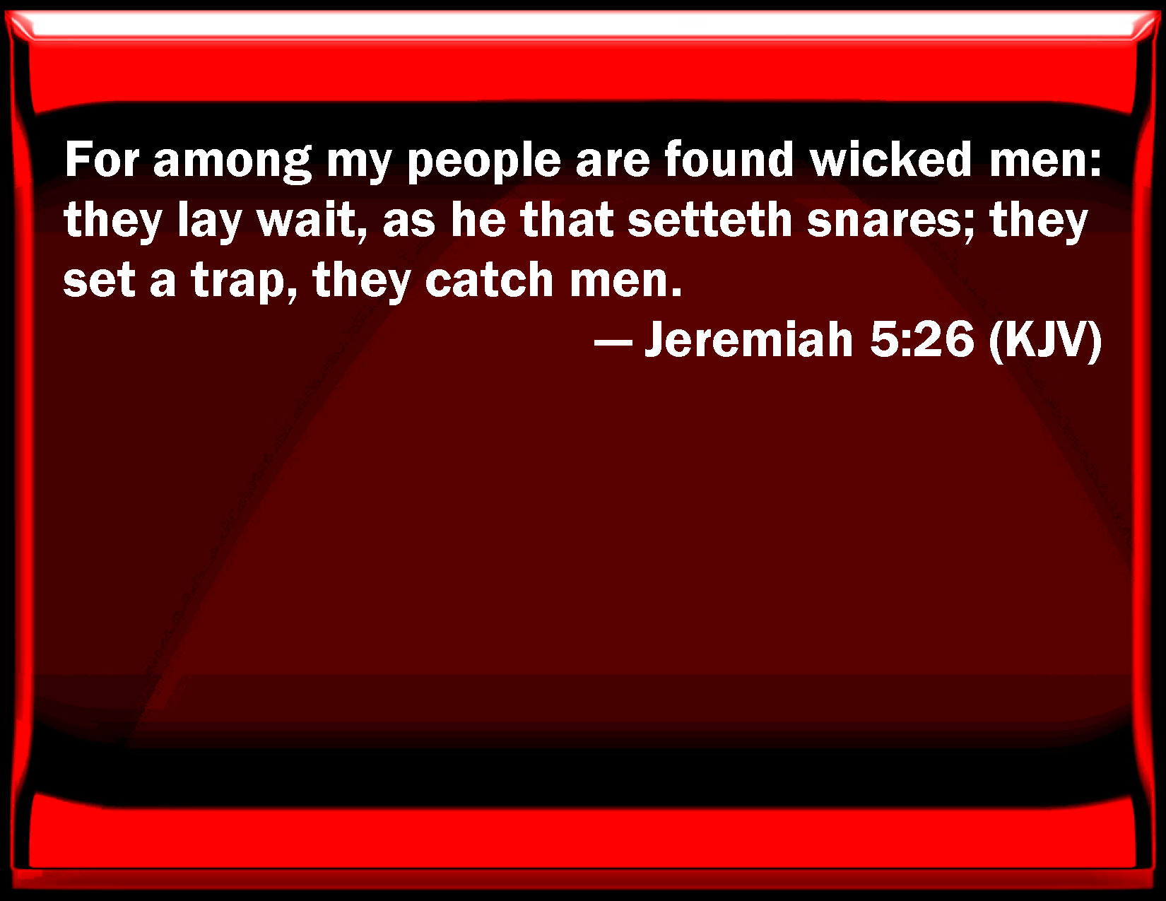 Bible Verse Slide Jeremiah 5:26 For among my people are found wicked men: they lay wait, as he that sets snares; they set a trap, they catch men. KJV: For among my people are found wicked men: they lay wait, as he that setteth snares; they set a trap, they catch men. DRB: For among my people are found wicked men, that lie in wait as fowlers, setting snares and traps to catch men. DBT: For among my people are found wicked men: they lay wait, as fowlers stoop down; they set a trap, they catch men. ERV: For among my people are found wicked men: they watch, as fowlers lie in wait; they set a trap, they catch men. WBT: For among my people are found wicked men: they lay wait, as he that setteth snares; they set a trap, they catch men. WEB: For among my people are found wicked men. They watch, as fowlers lie in wait. They set a trap. They catch men. YLT: For the wicked have been found among My people. It looketh about the covering of snares, They have set up a trap — men they capture.Links Jeremiah 5:26 NIV • Jeremiah 5:26 NLT • Jeremiah 5:26 ESV • Jeremiah 5:26 NASB • Jeremiah 5:26 KJV • Jeremiah 5:26 Interlinear • Jeremiah 5:26 Commentaries • Jeremiah 5:26 Parallel Texts • Jeremiah 5:26 Bible Apps • Jeremiah 5:26 Parallel • Bible Hub |