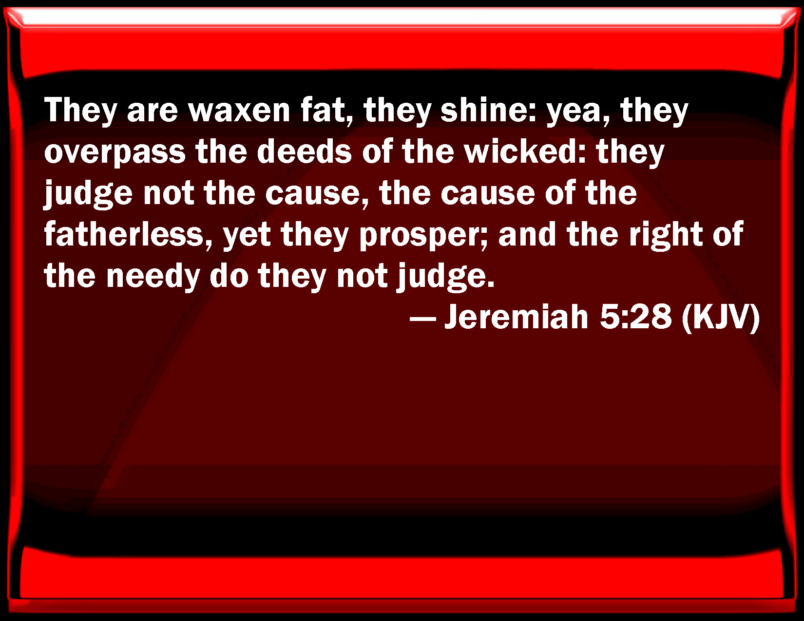 Bible Verse Slide Jeremiah 5:28 They are waxen fat, they shine: yes, they overpass the deeds of the wicked: they judge not the cause, the cause of the fatherless, yet they prosper; and the right of the needy do they not judge. KJV: They are waxen fat, they shine: yea, they overpass the deeds of the wicked: they judge not the cause, the cause of the fatherless, yet they prosper; and the right of the needy do they not judge. DRB: They are grown gross and fat: andhave most wickedly transgressed my words. They have not judged the cause of the widow, they have not managed the cause of the fatherless, they have not judged the judgement of the poor. DBT: They are become fat, they shine, yea, they surpass in deeds of wickedness; they judge not the cause, the cause of the fatherless, and they prosper; and the right of the needy do they not adjudge. ERV: They are waxen fat, they shine: yea, they overpass in deeds of wickedness: they plead not the cause, the cause of the fatherless, that they should prosper; and the right of the needy do they not judge. WBT: They have become fat, they shine: yes, they surpass the deeds of the wicked: they judge not the cause, the cause of the fatherless, yet they prosper; and the right of the needy do they not judge. WEB: They have grown fat. They shine; yes, they excell in deeds of wickedness. They don't plead the cause, the cause of the fatherless, that they may prosper; and they don't judge the right of the needy. YLT: They have been fat, they have shone, Yea, they have overpassed the acts of the evil, Judgment they have not judged, The judgment of the fatherless — and they prosper, And the judgment of the needy they have not judged.Links Jeremiah 5:28 NIV • Jeremiah 5:28 NLT • Jeremiah 5:28 ESV • Jeremiah 5:28 NASB • Jeremiah 5:28 KJV • Jeremiah 5:28 Interlinear • Jeremiah 5:28 Commentaries • Jeremiah 5:28 Parallel Texts • Jeremiah 5:28 Bible Apps • Jeremiah 5:28 Parallel • Bible Hub |
