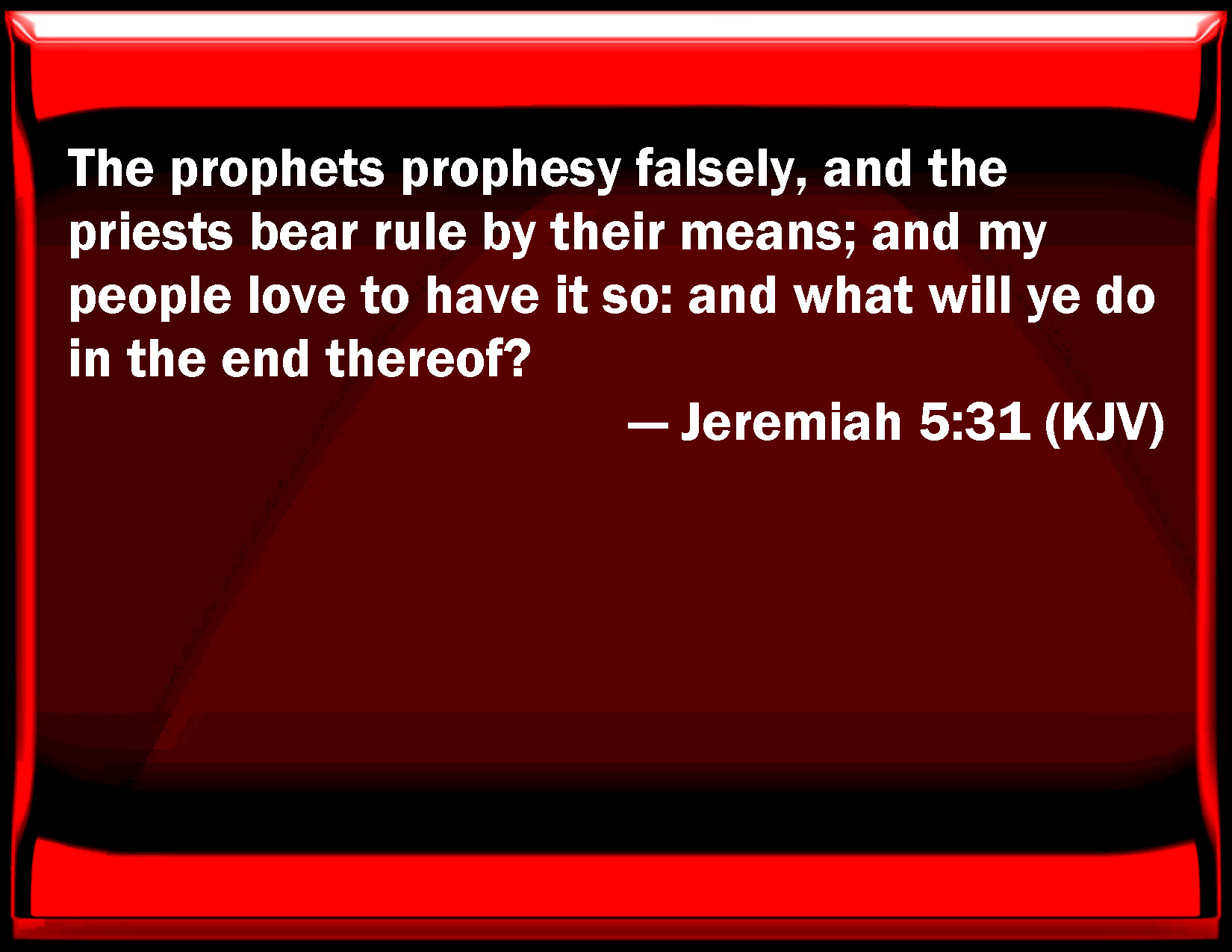 Bible Verse Slide Jeremiah 5:31 The prophets prophesy falsely, and the priests bear rule by their means; and my people love to have it so: and what will you do in the end thereof? KJV: The prophets prophesy falsely, and the priests bear rule by their means; and my people love to have it so: and what will ye do in the end thereof? DRB: The prophets prophesied falsehood, and the priests clapped their hands: and my people loved such things: what then shall be done in the end thereof? DBT: the prophets prophesy falsehood, and the priests rule by their means; and my people love to have it so. But what will ye do in the end thereof? ERV: the prophets prophesy falsely, and the priests bear rule by their means; and my people love to have it so: and what will ye do in the end thereof? WBT: The prophets prophesy falsely, and the priests bear rule by their means; and my people love to have it so: and what will ye do in the end thereof? WEB: The prophets prophesy falsely, and the priests rule by their own authority; and my people love to have it so. What will you do in the end of it? YLT: The prophets have prophesied falsely, And the priests bear rule by their means, And My people have loved it so, And what do they at its latter end?Links Jeremiah 5:31 NIV • Jeremiah 5:31 NLT • Jeremiah 5:31 ESV • Jeremiah 5:31 NASB • Jeremiah 5:31 KJV • Jeremiah 5:31 Interlinear • Jeremiah 5:31 Commentaries • Jeremiah 5:31 Parallel Texts • Jeremiah 5:31 Bible Apps • Jeremiah 5:31 Parallel • Bible Hub |