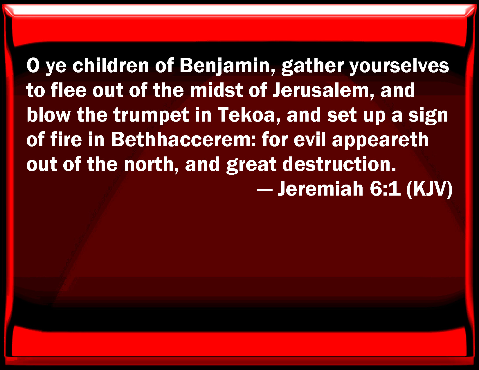 Bible Verse Slide Jeremiah 6:1 O you children of Benjamin, gather yourselves to flee out of the middle of Jerusalem, and blow the trumpet in Tekoa, and set up a sign of fire in Bethhaccerem: for evil appears out of the north, and great destruction. KJV: O ye children of Benjamin, gather yourselves to flee out of the midst of Jerusalem, and blow the trumpet in Tekoa, and set up a sign of fire in Bethhaccerem: for evil appeareth out of the north, and great destruction. DRB: Strengthen yourselves, ye sons of Benjamin, in the midst of Jerusalem, and sound the trumpet in Thecua, and set up the standard over Bethacarem: for evil is seen out of the north, and a great destruction. DBT: Flee for safety, ye children of Benjamin, out of the midst of Jerusalem, and blow the trumpet in Tekoa, and set up a signal in Beth-haccerem; for evil appeareth out of the north, and a great destruction. ERV: Flee for safety, ye children of Benjamin, out of the midst of Jerusalem, and blow the trumpet in Tekoa, and raise up a signal on Beth-haccherem: for evil looketh forth from the north, and a great destruction. WBT: O ye children of Benjamin, gather yourselves to flee out of the midst of Jerusalem, and blow the trumpet in Tekoa, and set up a sign of fire in Beth-haccerem: for evil appeareth out of the north, and great destruction. WEB: "Flee for safety, you children of Benjamin, out of the midst of Jerusalem, and blow the trumpet in Tekoa, and raise up a signal on Beth Haccherem; for evil looks forth from the north, and a great destruction. YLT: Strengthen yourselves, sons of Benjamin, From the midst of Jerusalem, And in Tekoa blow ye a trumpet, And over Beth-Haccerem lift ye up a flame, For evil hath been seen from the north, And great destruction.Links Jeremiah 6:1 NIV • Jeremiah 6:1 NLT • Jeremiah 6:1 ESV • Jeremiah 6:1 NASB • Jeremiah 6:1 KJV • Jeremiah 6:1 Interlinear • Jeremiah 6:1 Commentaries • Jeremiah 6:1 Parallel Texts • Jeremiah 6:1 Bible Apps • Jeremiah 6:1 Parallel • Bible Hub |