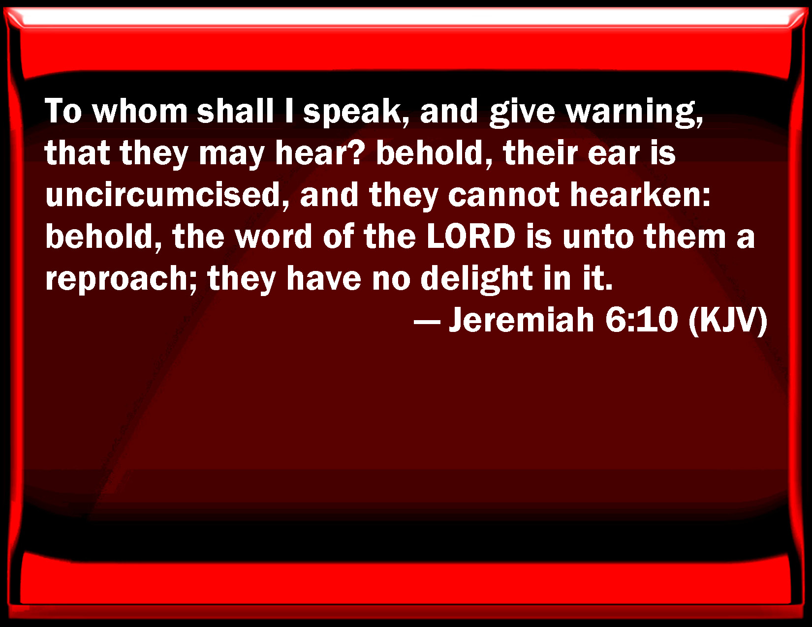 Bible Verse Slide Jeremiah 6:10 To whom shall I speak, and give warning, that they may hear? behold, their ear is uncircumcised, and they cannot listen: behold, the word of the LORD is to them a reproach; they have no delight in it. KJV: To whom shall I speak, and give warning, that they may hear? behold, their ear is uncircumcised, and they cannot hearken: behold, the word of the LORD is unto them a reproach; they have no delight in it. DRB: To whom shall I speak? and to whom shall I testify, that he may hear? behold, their ears are uncircumcised, and they cannot hear: behold the word of the Lord is become unto them a reproach: and and they will not receive it. DBT: To whom shall I speak and testify, that they may hear? Behold, their ear is uncircumcised, and they cannot hearken: behold, the word of Jehovah is unto them a reproach; they have no delight in it. ERV: To whom shall I speak and testify, that they may hear? behold, their ear is uncircumcised, and they cannot hearken: behold, the word of the LORD is become unto them a reproach; they have no delight in it. WBT: To whom shall I speak, and give warning, that they may hear? Behold, their ear is uncircumcised, and they cannot hearken: behold, the word of the LORD is to them a reproach; they have no delight in it. WEB: To whom shall I speak and testify, that they may hear? Behold, their ear is uncircumcised, and they can't listen. Behold, the word of Yahweh has become a reproach to them. They have no delight in it. YLT: To whom do I speak, and testify, and they hear? Lo, their ear is uncircumcised, And they are not able to attend. Lo, a word of Jehovah hath been to them for a reproach, They delight not in it.Links Jeremiah 6:10 NIV • Jeremiah 6:10 NLT • Jeremiah 6:10 ESV • Jeremiah 6:10 NASB • Jeremiah 6:10 KJV • Jeremiah 6:10 Interlinear • Jeremiah 6:10 Commentaries • Jeremiah 6:10 Parallel Texts • Jeremiah 6:10 Bible Apps • Jeremiah 6:10 Parallel • Bible Hub |