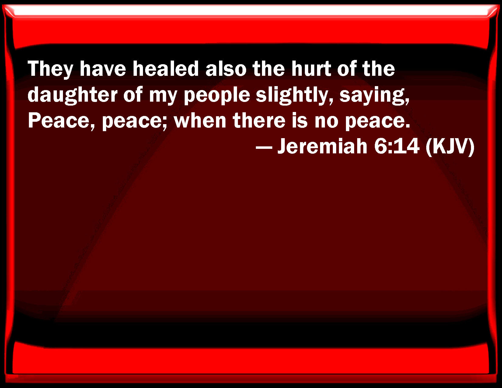 Bible Verse Slide Jeremiah 6:14 They have healed also the hurt of the daughter of my people slightly, saying, Peace, peace; when there is no peace. KJV: They have healed also the hurt of the daughter of my people slightly, saying, Peace, peace; when there is no peace. DRB: And they healed the breach of the daughter of my people disgracefully, saying: Peace, peace: and there was no peace. DBT: And they have healed the breach of the daughter of my people lightly, saying, Peace, peace! when there is no peace. ERV: They have healed also the hurt of my people lightly, saying, Peace, peace; when there is no peace. WBT: They have healed also the hurt of the daughter of my people slightly, saying, Peace, peace; when there is no peace. WEB: They have healed also the hurt of my people superficially, saying, 'Peace, peace!' when there is no peace. YLT: And they heal the breach of the daughter of my people slightly, Saying, 'Peace, peace!' and there is no peace.Links Jeremiah 6:14 NIV • Jeremiah 6:14 NLT • Jeremiah 6:14 ESV • Jeremiah 6:14 NASB • Jeremiah 6:14 KJV • Jeremiah 6:14 Interlinear • Jeremiah 6:14 Commentaries • Jeremiah 6:14 Parallel Texts • Jeremiah 6:14 Bible Apps • Jeremiah 6:14 Parallel • Bible Hub |
