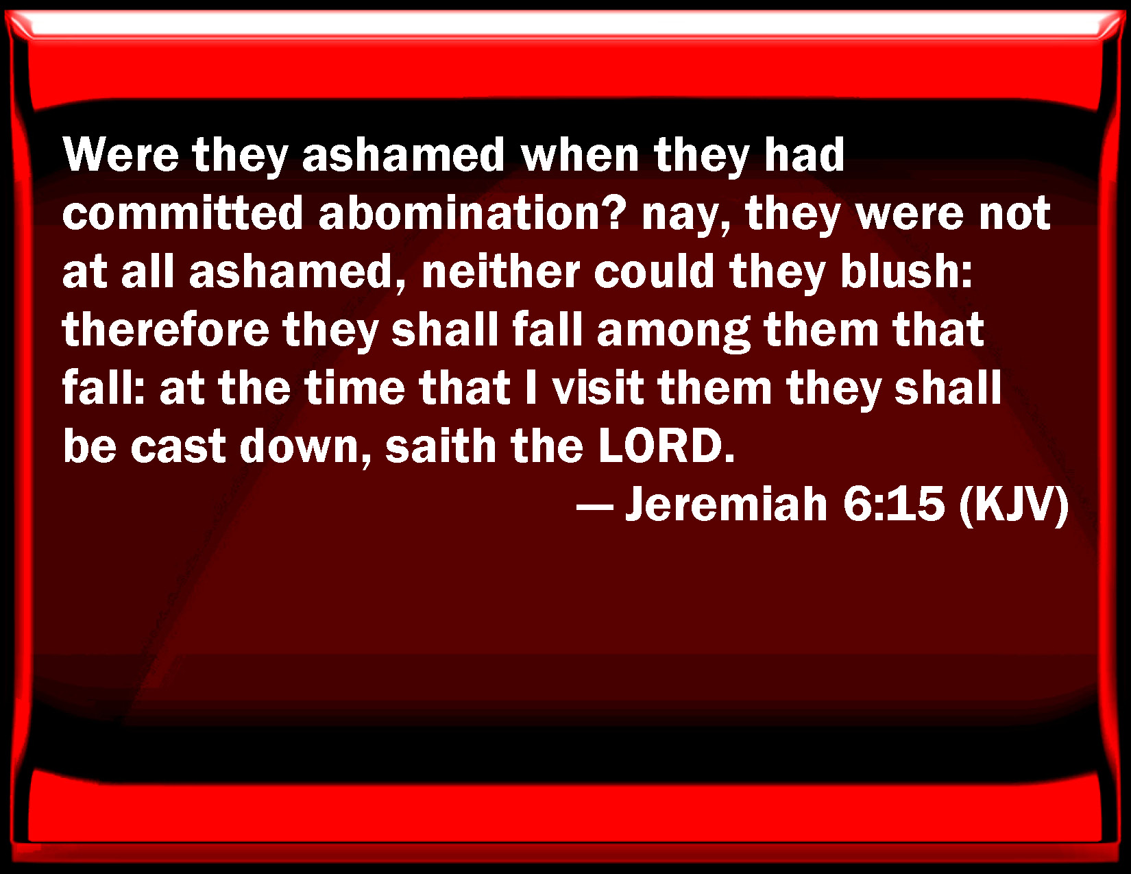 Bible Verse Slide Jeremiah 6:15 Were they ashamed when they had committed abomination? no, they were not at all ashamed, neither could they blush: therefore they shall fall among them that fall: at the time that I visit them they shall be cast down, said the LORD. KJV: Were they ashamed when they had committed abomination? nay, they were not at all ashamed, neither could they blush: therefore they shall fall among them that fall: at the time that I visit them they shall be cast down, saith the LORD. DRB: They were confounded, because they commmitted abomination: yea, rather they were not confounded with confusion, and they knew not how to blush: wherefore they shall fall among them that fall: in the time of their visitation they shall fall down, saith the Lord. DBT: Are they ashamed that they have committed abomination? Nay, they are not at all ashamed, neither know they what it is to blush. Therefore they shall fall among them that fall; at the time that I visit them they shall stumble, saith Jehovah. ERV: Were they ashamed when they had committed abomination? nay, they were not at all ashamed, neither could they blush: therefore they shall fall among them that fall: at the time that I visit them they shall be cast down, saith the LORD. WBT: Were they ashamed when they had committed abomination? no, they were not at all ashamed, neither could they blush: therefore they shall fall among them that fall: at the time that I visit them they shall be cast down, saith the LORD. WEB: Were they ashamed when they had committed abomination? No, they were not at all ashamed, neither could they blush. Therefore they shall fall among those who fall; at the time that I visit them, they shall be cast down," says Yahweh. YLT: They were ashamed when they did abomination! Yea, they are not at all ashamed, Yea, blushing they have not known, Therefore they do fall among those falling, In the time I have inspected them, They stumble, said Jehovah.Links Jeremiah 6:15 NIV • Jeremiah 6:15 NLT • Jeremiah 6:15 ESV • Jeremiah 6:15 NASB • Jeremiah 6:15 KJV • Jeremiah 6:15 Interlinear • Jeremiah 6:15 Commentaries • Jeremiah 6:15 Parallel Texts • Jeremiah 6:15 Bible Apps • Jeremiah 6:15 Parallel • Bible Hub |