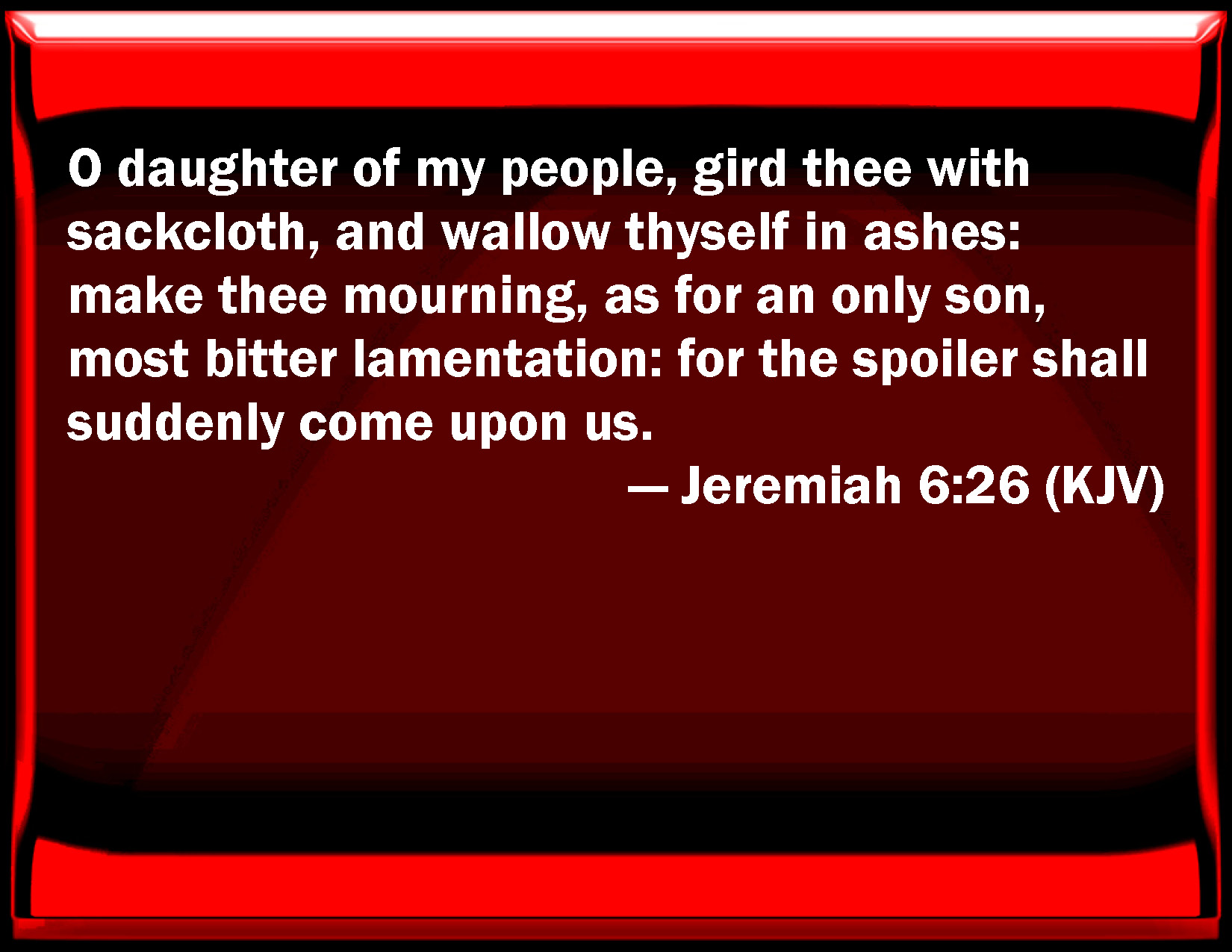 Bible Verse Slide Jeremiah 6:26 O daughter of my people, gird you with sackcloth, and wallow yourself in ashes: make you mourning, as for an only son, most bitter lamentation: for the spoiler shall suddenly come on us. KJV: O daughter of my people, gird thee with sackcloth, and wallow thyself in ashes: make thee mourning, as for an only son, most bitter lamentation: for the spoiler shall suddenly come upon us. DRB: Gird thee with sackcloth, O daughter of my people, and sprinkle thee with ashes: make thee mourning as for an only son, a bitter lamentation, because the destroyer shall suddenly come upon us. DBT: Daughter of my people, gird thee with sackcloth, and roll thyself in ashes: make mourning, as for an only son bitter lamentation; for the spoiler cometh suddenly upon us. ERV: O daughter of my people, gird thee with sackcloth, and wallow thyself in ashes: make thee mourning, as for an only son, most bitter lamentation; for the spoiler shall suddenly come upon us. WBT: O daughter of my people, gird thee with sackcloth, and wallow thyself in ashes: make thee mourning, as for an only son, most bitter lamentation: for the spoiler shall suddenly come upon us. WEB: Daughter of my people, clothe yourself with sackcloth, and wallow in ashes! Mourn, as for an only son, most bitter lamentation; for the destroyer shall suddenly come on us. YLT: O daughter of My people, Gird on sackcloth, and roll thyself in ashes, The mourning of an only one make for thee, A lamentation most bitter, For suddenly come doth the spoiler against us.Links Jeremiah 6:26 NIV • Jeremiah 6:26 NLT • Jeremiah 6:26 ESV • Jeremiah 6:26 NASB • Jeremiah 6:26 KJV • Jeremiah 6:26 Interlinear • Jeremiah 6:26 Commentaries • Jeremiah 6:26 Parallel Texts • Jeremiah 6:26 Bible Apps • Jeremiah 6:26 Parallel • Bible Hub |