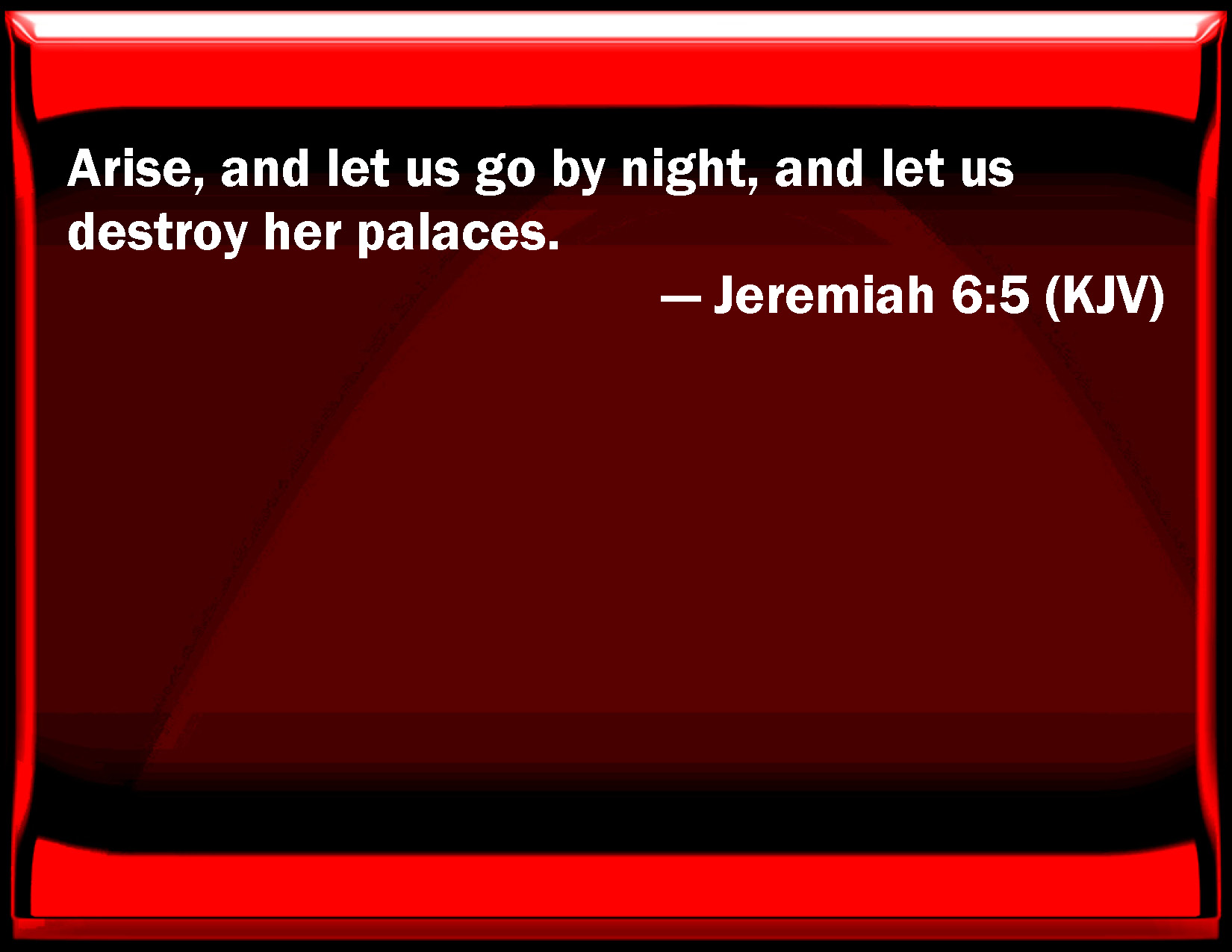 Bible Verse Slide Jeremiah 6:5 Arise, and let us go by night, and let us destroy her palaces. KJV: Arise, and let us go by night, and let us destroy her palaces. DRB: Arise, and let us go up in the night, and destroy her houses. DBT: Arise, and let us go up by night, and let us destroy her palaces. ERV: Arise, and let us go up by night, and let us destroy her palaces. WBT: Arise, and let us go by night, and let us destroy her palaces. WEB: Arise, and let us go up by night, and let us destroy her palaces." YLT: 'Rise, and we go up by night, And we destroy her palaces.'Links Jeremiah 6:5 NIV • Jeremiah 6:5 NLT • Jeremiah 6:5 ESV • Jeremiah 6:5 NASB • Jeremiah 6:5 KJV • Jeremiah 6:5 Interlinear • Jeremiah 6:5 Commentaries • Jeremiah 6:5 Parallel Texts • Jeremiah 6:5 Bible Apps • Jeremiah 6:5 Parallel • Bible Hub |