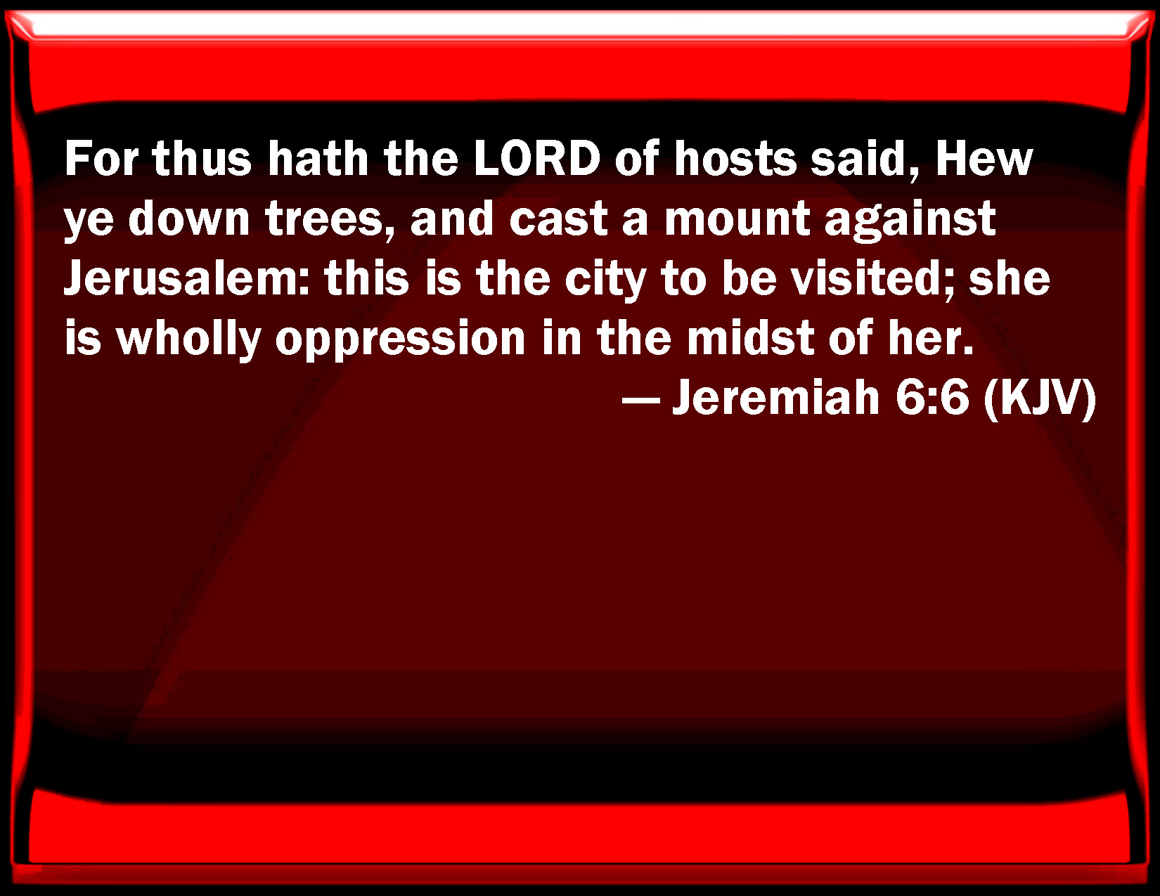 Bible Verse Slide Jeremiah 6:6 For thus has the LORD of hosts said, Hew you down trees, and cast a mount against Jerusalem: this is the city to be visited; she is wholly oppression in the middle of her. KJV: For thus hath the LORD of hosts said, Hew ye down trees, and cast a mount against Jerusalem: this is the city to be visited; she is wholly oppression in the midst of her. DRB: For thus saith the Lord of hosts: Hew down her trees, cast up a trench about Jerusalem: this is the city to be visited, all oppression is in the midst of her. DBT: For thus hath Jehovah of hosts said: Hew ye down trees, and cast a mound against Jerusalem. She is the city to be visited; she is wholly oppression in the midst of her. ERV: For thus hath the LORD of hosts said, Hew ye down trees, and cast up a mount against Jerusalem: this is the city to be visited; she is wholly oppression in the midst of her. WBT: For thus hath the LORD of hosts said, Hew ye down trees, and cast a mount against Jerusalem: this is the city to be visited; she is wholly oppression in the midst of her. WEB: For Yahweh of Armies said, "Cut down trees, and cast up a mound against Jerusalem: this is the city to be visited; she is wholly oppression in the midst of her. YLT: For thus said Jehovah of Hosts: Cut down her wood, And pour out against Jerusalem a mount, She is the city to be inspected, Wholly — she is oppression in her midst.Links Jeremiah 6:6 NIV • Jeremiah 6:6 NLT • Jeremiah 6:6 ESV • Jeremiah 6:6 NASB • Jeremiah 6:6 KJV • Jeremiah 6:6 Interlinear • Jeremiah 6:6 Commentaries • Jeremiah 6:6 Parallel Texts • Jeremiah 6:6 Bible Apps • Jeremiah 6:6 Parallel • Bible Hub |