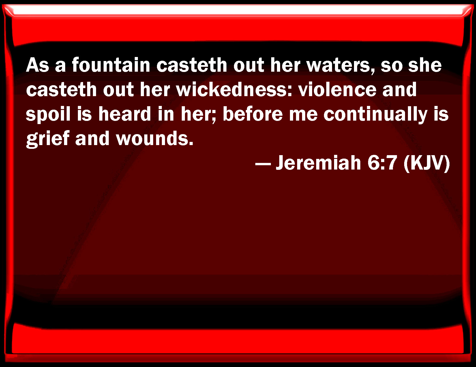 Bible Verse Slide Jeremiah 6:7 As a fountain casts out her waters, so she casts out her wickedness: violence and spoil is heard in her; before me continually is grief and wounds. KJV: As a fountain casteth out her waters, so she casteth out her wickedness: violence and spoil is heard in her; before me continually is grief and wounds. DRB: As a cistern maketh its water cold, so hath she made her wickedness cold: violence and spoil shall be heard in her, infirmity and stripes are continually before me. DBT: As a well poureth forth her waters, so she poureth forth her wickedness: violence and destruction are heard in her; before me continually are grief and wounds. ERV: As a well casteth forth her waters, so she casteth forth her wickedness: violence and spoil is heard in her; before me continually is sickness and wounds. WBT: As a fountain casteth out her waters, so she casteth out her wickedness: violence and devastation is heard in her; before me continually are grief and wounds. WEB: As a well casts forth its waters, so she casts forth her wickedness: violence and destruction is heard in her; before me continually is sickness and wounds. YLT: As the digging of a well, is for its waters, So she hath digged for her wickedness, Violence and spoil is heard in her, Before My face continually are sickness and smiting.Links Jeremiah 6:7 NIV • Jeremiah 6:7 NLT • Jeremiah 6:7 ESV • Jeremiah 6:7 NASB • Jeremiah 6:7 KJV • Jeremiah 6:7 Interlinear • Jeremiah 6:7 Commentaries • Jeremiah 6:7 Parallel Texts • Jeremiah 6:7 Bible Apps • Jeremiah 6:7 Parallel • Bible Hub |