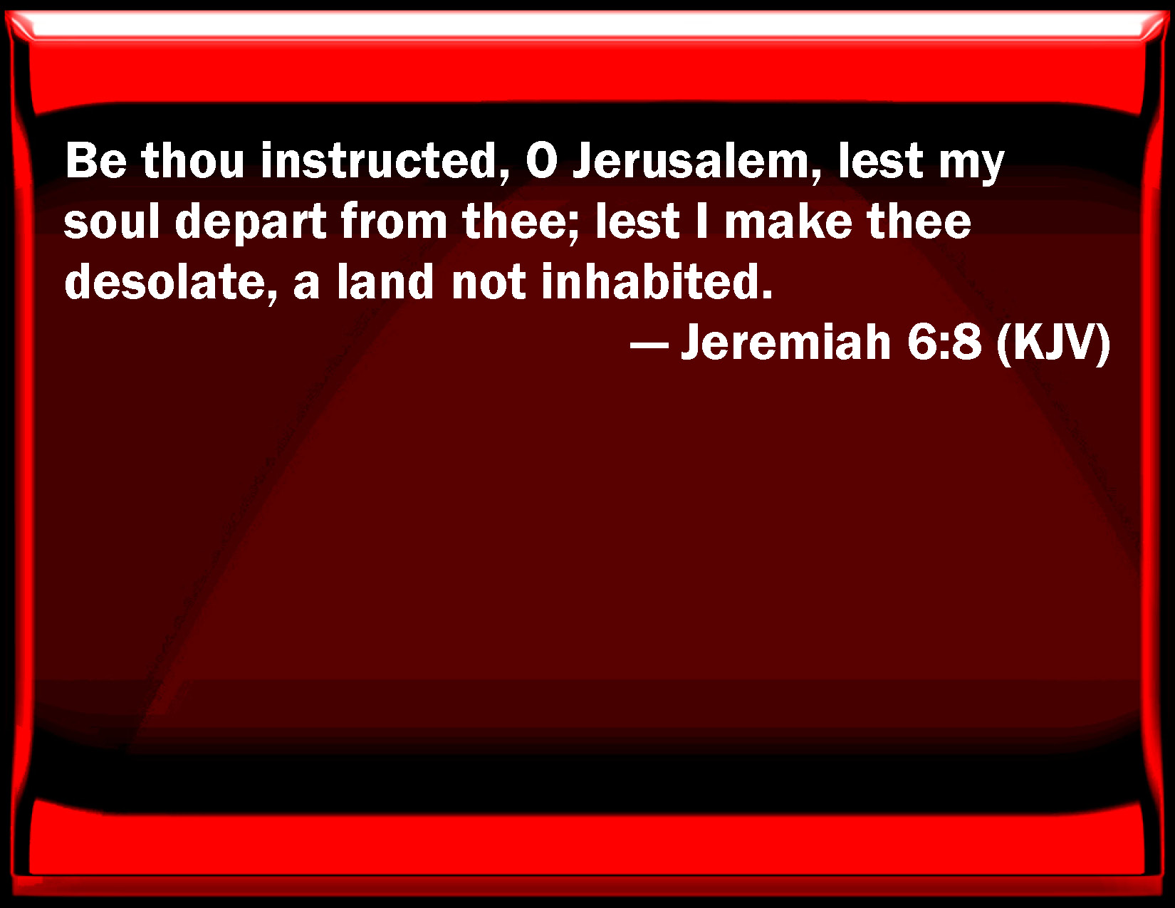 Bible Verse Slide Jeremiah 6:8 Be you instructed, O Jerusalem, lest my soul depart from you; lest I make you desolate, a land not inhabited. KJV: Be thou instructed, O Jerusalem, lest my soul depart from thee; lest I make thee desolate, a land not inhabited. DRB: Be thou instructed, O Jerusalem, lest my soul depart from thee, lest I make thee desolate, a land uninhabited. DBT: Be thou instructed, Jerusalem, lest my soul be alienated from thee; lest I make thee a desolation, a land not inhabited. ERV: Be thou instructed, O Jerusalem, lest my soul be alienated from thee; lest I make thee a desolation, a land not inhabited. WBT: Be thou instructed, O Jerusalem, lest my soul depart from thee; lest I make thee desolate, a land not inhabited. WEB: Be instructed, Jerusalem, lest my soul be alienated from you; lest I make you a desolation, a land not inhabited." YLT: Be instructed, O Jerusalem, Lest My soul be alienated from thee, Lest I make thee a desolation, a land not inhabited.Links Jeremiah 6:8 NIV • Jeremiah 6:8 NLT • Jeremiah 6:8 ESV • Jeremiah 6:8 NASB • Jeremiah 6:8 KJV • Jeremiah 6:8 Interlinear • Jeremiah 6:8 Commentaries • Jeremiah 6:8 Parallel Texts • Jeremiah 6:8 Bible Apps • Jeremiah 6:8 Parallel • Bible Hub |