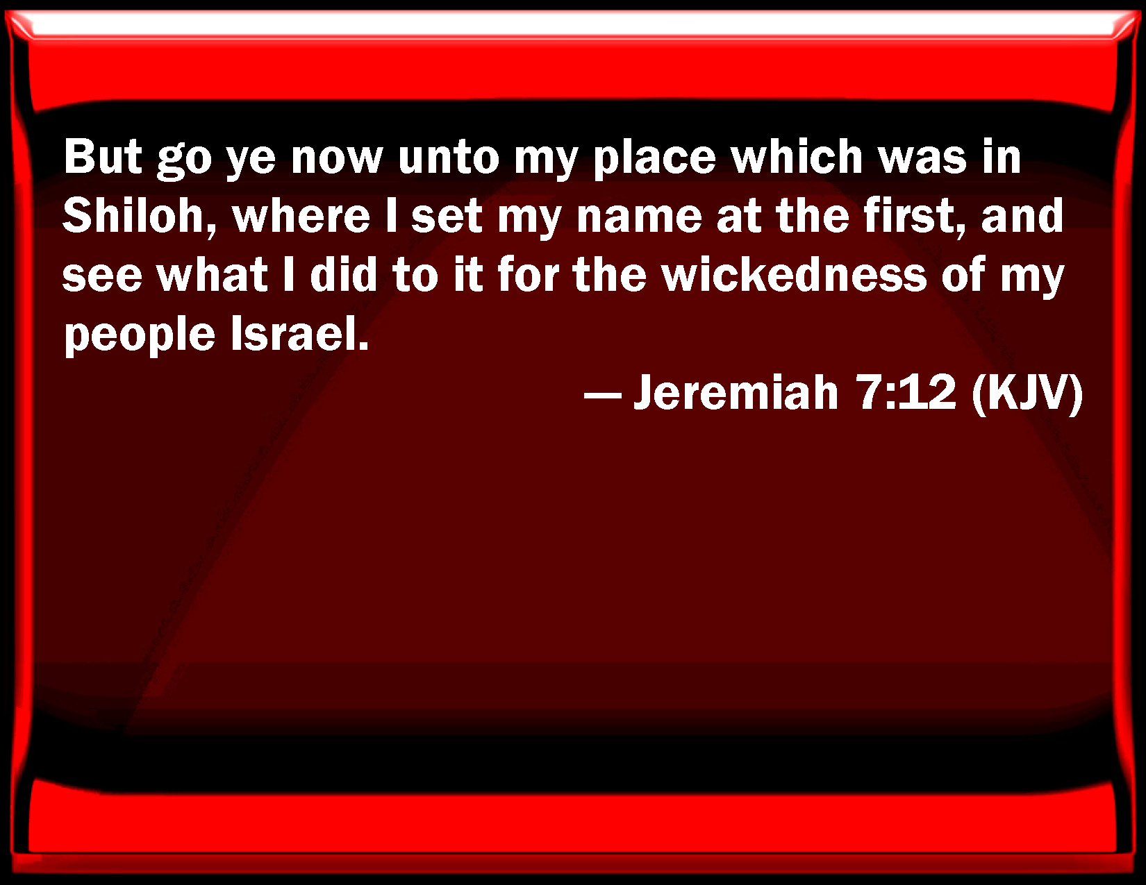 Bible Verse Slide Jeremiah 7:12 But go you now to my place which was in Shiloh, where I set my name at the first, and see what I did to it for the wickedness of my people Israel. KJV: But go ye now unto my place which was in Shiloh, where I set my name at the first, and see what I did to it for the wickedness of my people Israel. DRB: Go ye to my place in Silo, where my name dwelt from the beginning: and see what I did to it for the wickedness of my people Israel: DBT: For go now unto my place which was in Shiloh, where I caused my name to dwell at the first, and see what I did to it, for the wickedness of my people Israel. ERV: But go ye now unto my place which was in Shiloh, where I caused my name to dwell at the first, and see what I did to it for the wickedness of my people Israel. WBT: But go ye now to my place which was in Shiloh, where I set my name at the first, and see what I did to it for the wickedness of my people Israel. WEB: But go now to my place which was in Shiloh, where I caused my name to dwell at the first, and see what I did to it for the wickedness of my people Israel. YLT: But go ye, I pray you, Unto My place that is in Shiloh, Where I caused My name to dwell at first, And see that which I have done to it, For the wickedness of My people Israel.Links Jeremiah 7:12 NIV • Jeremiah 7:12 NLT • Jeremiah 7:12 ESV • Jeremiah 7:12 NASB • Jeremiah 7:12 KJV • Jeremiah 7:12 Interlinear • Jeremiah 7:12 Commentaries • Jeremiah 7:12 Parallel Texts • Jeremiah 7:12 Bible Apps • Jeremiah 7:12 Parallel • Bible Hub |