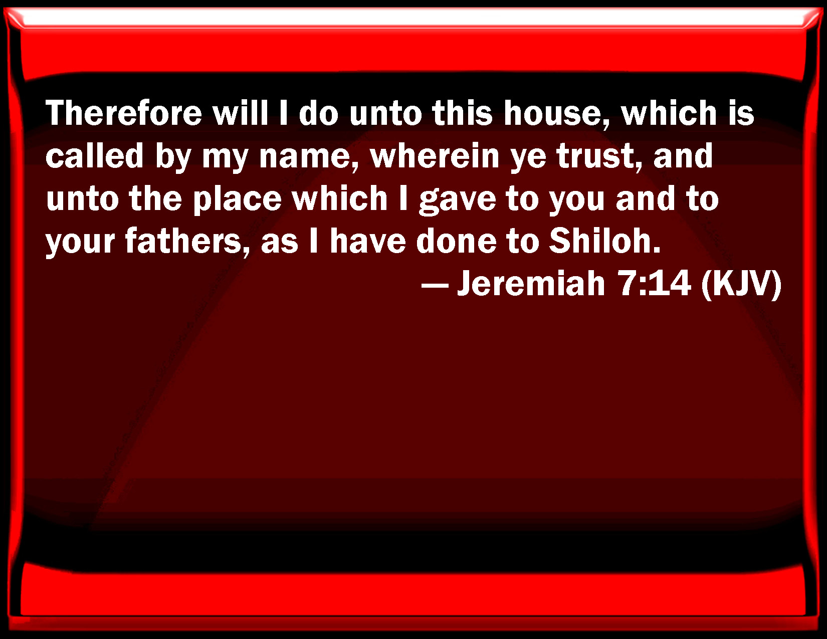 Bible Verse Slide Jeremiah 7:14 Therefore will I do to this house, which is called by my name, wherein you trust, and to the place which I gave to you and to your fathers, as I have done to Shiloh. KJV: Therefore will I do unto this house, which is called by my name, wherein ye trust, and unto the place which I gave to you and to your fathers, as I have done to Shiloh. DRB: I will do to this house, in which my name is called upon, and in which you trust, and to the places which I have given you and your fathers, as I did to Silo. DBT: I will even do unto the house which is called by my name, wherein ye trust, and unto the place which I gave to you and to your fathers, as I have done to Shiloh; ERV: therefore will I do unto the house, which is called by my name, wherein ye trust, and unto the place which I gave to you and to your fathers, as I have done to Shiloh. WBT: Therefore will I do to this house, which is called by my name, in which ye trust, and to the place which I gave to you and to your fathers, as I have done to Shiloh. WEB: therefore will I do to the house which is called by my name, in which you trust, and to the place which I gave to you and to your fathers, as I did to Shiloh. YLT: I also to the house on which My name is called, In which ye are trusting, And to the place that I gave to you, and to your fathers, Have done, as I have done to Shiloh.Links Jeremiah 7:14 NIV • Jeremiah 7:14 NLT • Jeremiah 7:14 ESV • Jeremiah 7:14 NASB • Jeremiah 7:14 KJV • Jeremiah 7:14 Interlinear • Jeremiah 7:14 Commentaries • Jeremiah 7:14 Parallel Texts • Jeremiah 7:14 Bible Apps • Jeremiah 7:14 Parallel • Bible Hub |