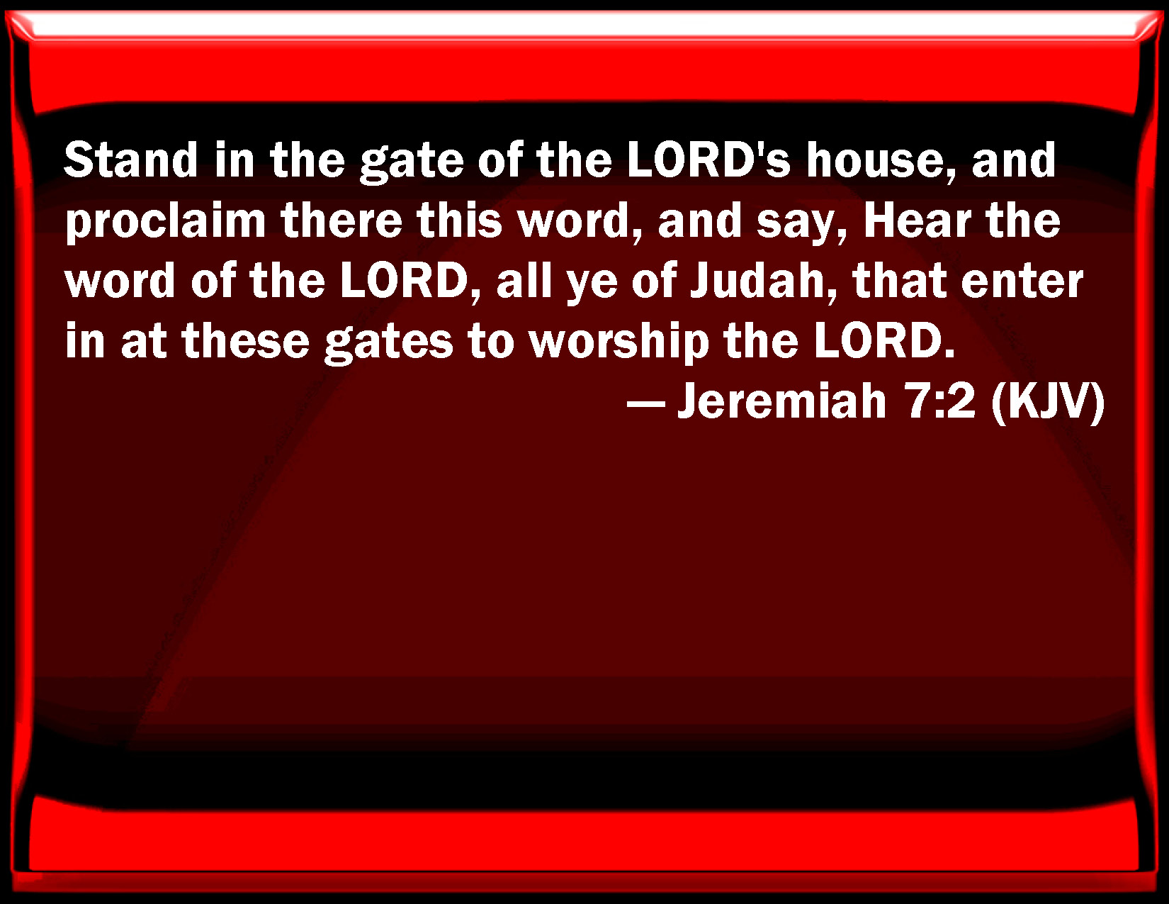 Bible Verse Slide Jeremiah 7:2 Stand in the gate of the LORD's house, and proclaim there this word, and say, Hear the word of the LORD, all you of Judah, that enter in at these gates to worship the LORD. KJV: Stand in the gate of the LORD'S house, and proclaim there this word, and say, Hear the word of the LORD, all ye of Judah, that enter in at these gates to worship the LORD. DRB: Stand in the gate of the house of the Lord, and proclaim there this word, and say: Hear ye the word of the Lord, all ye men of Juda, that enter in at these gates, to adore the Lord. DBT: Stand in the gate of Jehovah's house, and proclaim there this word, and say, Hear ye the word of Jehovah, all Judah, that enter in at these gates to worship Jehovah. ERV: Stand in the gate of the LORD'S house, and proclaim there this word, and say, Hear the word of the LORD, all ye of Judah, that enter in at these gates to worship the LORD. WBT: Stand in the gate of the LORD'S house, and proclaim there this word, and say, Hear the word of the LORD, all ye of Judah, that enter in at these gates to worship the LORD. WEB: "Stand in the gate of Yahweh's house, and proclaim there this word, and say, 'Hear the word of Yahweh, all you of Judah, who enter in at these gates to worship Yahweh. YLT: Stand in the gate of the house of Jehovah, and thou hast proclaimed there this word, and hast said, Hear a word of Jehovah, all ye of Judah, who are coming in at these gates, to bow before Jehovah:Links Jeremiah 7:2 NIV • Jeremiah 7:2 NLT • Jeremiah 7:2 ESV • Jeremiah 7:2 NASB • Jeremiah 7:2 KJV • Jeremiah 7:2 Interlinear • Jeremiah 7:2 Commentaries • Jeremiah 7:2 Parallel Texts • Jeremiah 7:2 Bible Apps • Jeremiah 7:2 Parallel • Bible Hub |