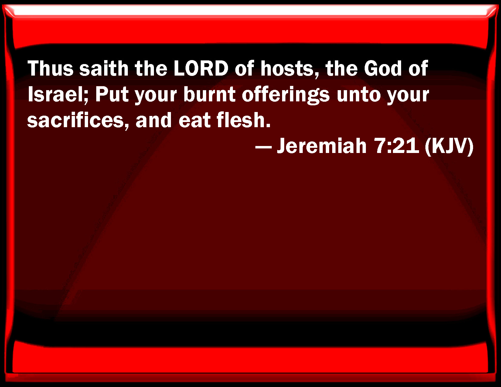 Bible Verse Slide Jeremiah 7:21 Thus said the LORD of hosts, the God of Israel; Put your burnt offerings to your sacrifices, and eat flesh. KJV: Thus saith the LORD of hosts, the God of Israel; Put your burnt offerings unto your sacrifices, and eat flesh. DRB: Thus saith the Lord of hosts the God of Israel: Add your burnt offerings to your sacrifices, and eat ye the flesh. DBT: Thus saith Jehovah of hosts, the God of Israel: Add your burnt-offerings to your sacrifices, and eat the flesh. ERV: Thus saith the LORD of hosts, the God of Israel: Add your burnt offerings unto your sacrifices, and eat ye flesh. WBT: Thus saith the LORD of hosts, the God of Israel; Put your burnt-offerings to your sacrifices, and eat flesh. WEB: Thus says Yahweh of Armies, the God of Israel: Add your burnt offerings to your sacrifices, and eat meat. YLT: Thus said Jehovah of Hosts, God of Israel, Your burnt-offerings add to your sacrifices, And eat ye flesh.Links Jeremiah 7:21 NIV • Jeremiah 7:21 NLT • Jeremiah 7:21 ESV • Jeremiah 7:21 NASB • Jeremiah 7:21 KJV • Jeremiah 7:21 Interlinear • Jeremiah 7:21 Commentaries • Jeremiah 7:21 Parallel Texts • Jeremiah 7:21 Bible Apps • Jeremiah 7:21 Parallel • Bible Hub |