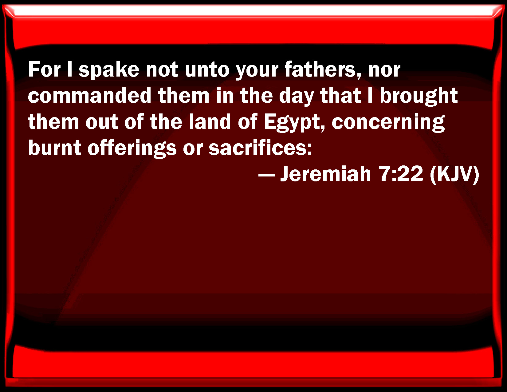 Bible Verse Slide Jeremiah 7:22 For I spoke not to your fathers, nor commanded them in the day that I brought them out of the land of Egypt, concerning burnt offerings or sacrifices: KJV: For I spake not unto your fathers, nor commanded them in the day that I brought them out of the land of Egypt, concerning burnt offerings or sacrifices: DRB: For I spoke not to your fathers, and I commanded them not, in the day that I brought them out of the land of Egypt, concerning the matter of burnt offerings and sacrifices. DBT: For I spoke not unto your fathers, nor commanded them concerning burnt-offerings and sacrifices, in the day that I brought them out of the land of Egypt; ERV: For I spake not unto your fathers, nor commanded them in the day that I brought them out of the land of Egypt, concerning burnt offerings or sacrifices: WBT: For I spoke not to your fathers, nor commanded them in the day that I brought them out of the land of Egypt, concerning burnt-offerings or sacrifices: WEB: For I didn't speak to your fathers, nor command them in the day that I brought them out of the land of Egypt, concerning burnt offerings or sacrifices: YLT: For I did not speak with your fathers, Nor did I command them in the day of My bringing them out of the land of Egypt, Concerning the matters of burnt-offering and sacrifice,Links Jeremiah 7:22 NIV • Jeremiah 7:22 NLT • Jeremiah 7:22 ESV • Jeremiah 7:22 NASB • Jeremiah 7:22 KJV • Jeremiah 7:22 Interlinear • Jeremiah 7:22 Commentaries • Jeremiah 7:22 Parallel Texts • Jeremiah 7:22 Bible Apps • Jeremiah 7:22 Parallel • Bible Hub |
