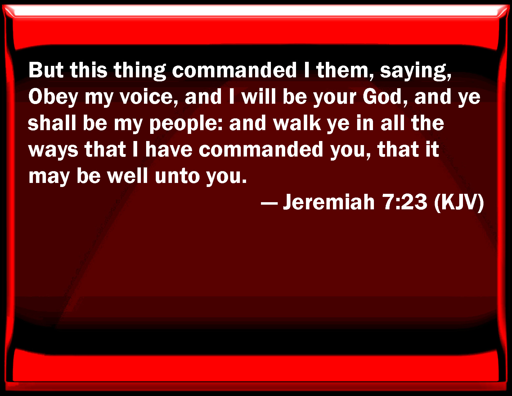 Bible Verse Slide Jeremiah 7:23 But this thing commanded I them, saying, Obey my voice, and I will be your God, and you shall be my people: and walk you in all the ways that I have commanded you, that it may be well to you. KJV: But this thing commanded I them, saying, Obey my voice, and I will be your God, and ye shall be my people: and walk ye in all the ways that I have commanded you, that it may be well unto you. DRB: But this thing I commanded them, saying: Hearken to my voice, and I will be your God, and you shall be my people: and walk ye in all the way that I have commanded you, that it may be well with you. DBT: but I commanded them this thing, saying, Hearken unto my voice, and I will be your God, and ye shall be my people; and walk in all the way that I command you, that it may be well with you. ERV: but this thing I commanded them, saying, Hearken unto my voice, and I will be your God, and ye shall be my people: and walk ye in all the way that I command you, that it may be well with you. WBT: But this thing I commanded them, saying, Obey my voice, and I will be your God, and ye shall be my people: and walk ye in all the ways that I have commanded you, that it may be well to you. WEB: but this thing I commanded them, saying, Listen to my voice, and I will be your God, and you shall be my people; and walk in all the way that I command you, that it may be well with you. YLT: But this thing I commanded them, saying: Hearken to My voice, And I have been to you for God, And ye — ye are to Me for a people, And have walked in all the way that I command you, So that it is well for you.Links Jeremiah 7:23 NIV • Jeremiah 7:23 NLT • Jeremiah 7:23 ESV • Jeremiah 7:23 NASB • Jeremiah 7:23 KJV • Jeremiah 7:23 Interlinear • Jeremiah 7:23 Commentaries • Jeremiah 7:23 Parallel Texts • Jeremiah 7:23 Bible Apps • Jeremiah 7:23 Parallel • Bible Hub |