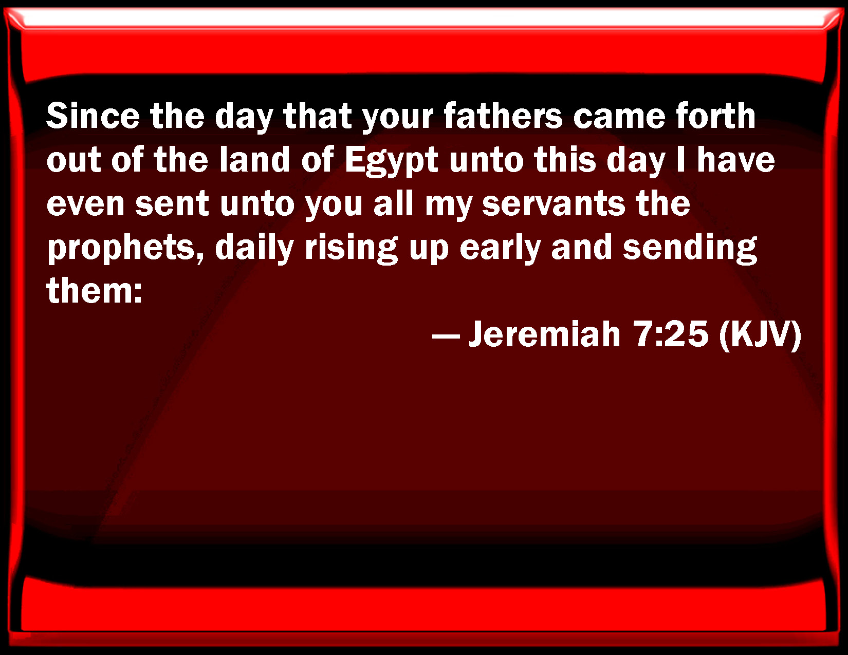 Bible Verse Slide Jeremiah 7:25 Since the day that your fathers came forth out of the land of Egypt to this day I have even sent to you all my servants the prophets, daily rising up early and sending them: KJV: Since the day that your fathers came forth out of the land of Egypt unto this day I have even sent unto you all my servants the prophets, daily rising up early and sending them: DRB: From the day that their fathers came out of the land of Egypt, even to this day. And I have sent to you all my servants the prophets from day to day, rising up early and sending. DBT: Since the day that your fathers came forth out of the land of Egypt, unto this day, have I sent unto you all my servants the prophets, daily rising up early and sending them; ERV: Since the day that your fathers came forth out of the land of Egypt unto this day, I have sent unto you all my servants the prophets, daily rising up early and sending them: WBT: Since the day that your fathers came forth from the land of Egypt to this day I have even sent to you all my servants the prophets, daily rising early and sending them: WEB: Since the day that your fathers came forth out of the land of Egypt to this day, I have sent to you all my servants the prophets, daily rising up early and sending them: YLT: Even from the day when your fathers Went out of the land of Egypt till this day, I send to you all my servants the prophets, Daily rising early and sending,Links Jeremiah 7:25 NIV • Jeremiah 7:25 NLT • Jeremiah 7:25 ESV • Jeremiah 7:25 NASB • Jeremiah 7:25 KJV • Jeremiah 7:25 Interlinear • Jeremiah 7:25 Commentaries • Jeremiah 7:25 Parallel Texts • Jeremiah 7:25 Bible Apps • Jeremiah 7:25 Parallel • Bible Hub |